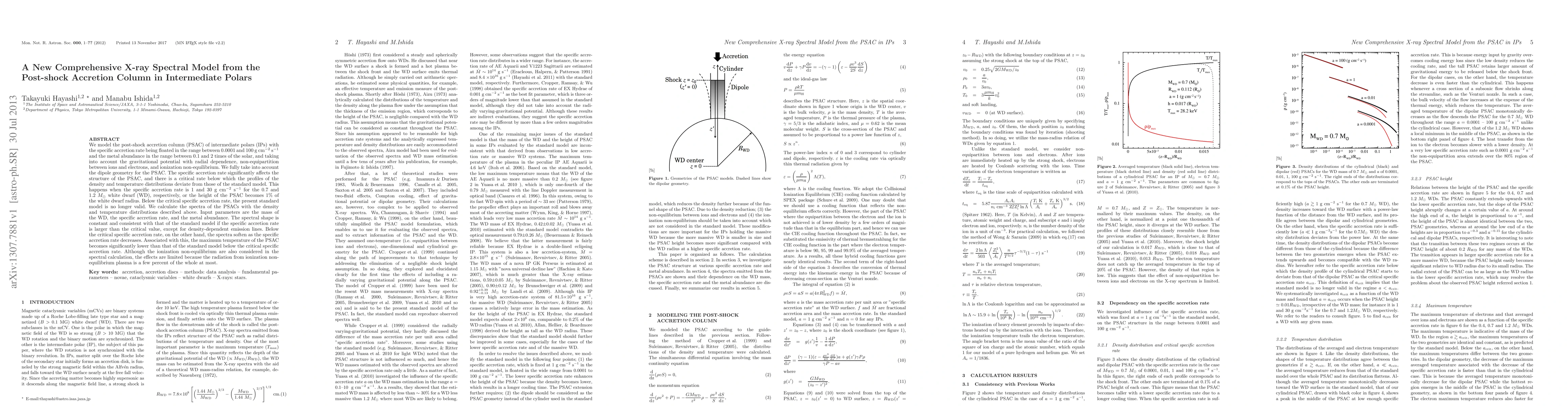 We model the post-shock accretion column (PSAC) for intermediate polars (IPs), with parameterizing specific accretion rate between 0.0001 and 100 g cm-2 s-1 and metal abundance between 0.1 and 2 times of solar abundance, and taking into account the gravitational potential and non-equipartition between ions, electrons and ionization degree. We assume the cylinder and dipole as geometry of the PSAC. The PSAC becomes higher against the white dwarf (WD) radius for lower specific accretion rate and more massive WD, and may be comparable to the WD radius. The consideration of the dipolar geometry significantly reduces the density and temperature over the whole PSAC comparing with the cylindrical case when the specific accretion rate is lower than a threshold which the PSAC height reachs 0.2 RWD with and is decreased by the more massive white dwarf. We calculate the spectra of the cylindrical and dipolar PSACs with the wide range of the specific accretion rate. Although the spectra soften as the specific accretion rate decreases for the both geometrical assumptions under the specific accretion rate threshold, the softening is more speedy for the dipolar PSAC. The fact means that the both geometrical assumptions lead the different WD masses for each other when their spectra are applied to the IPs hosting the low accretion or a massive WD. Although the ionization non-equilibrium are also involved for the spectral calculation, the effects are trivial because the radiation from ionization non-equilibrium plasma is a few percent of the whole at most.
