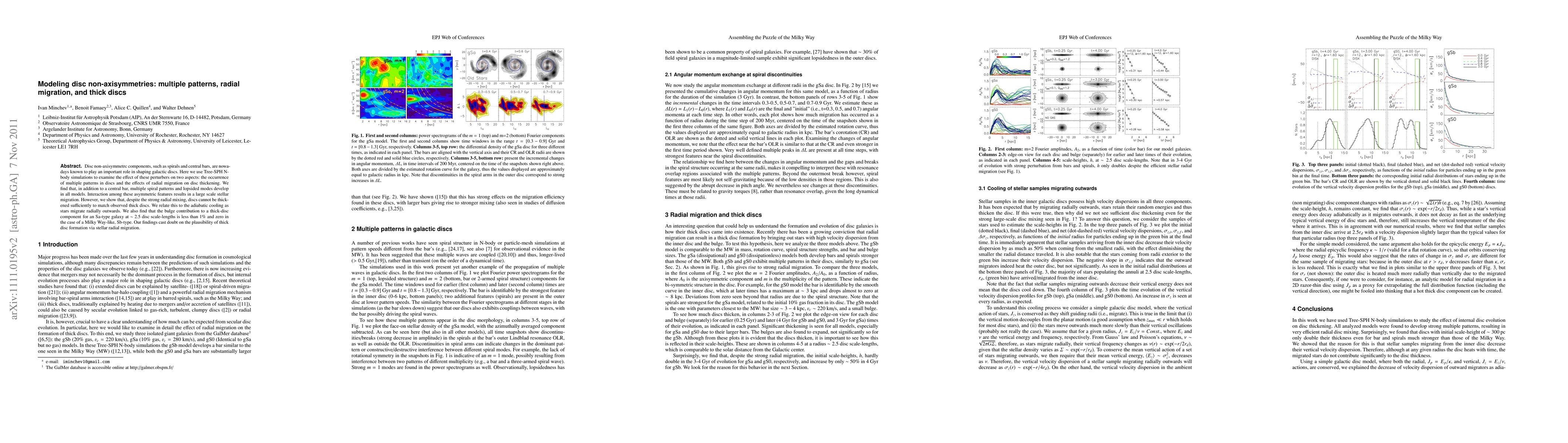 Disc non-axisymmetrc components, such as spirals and central bars, are nowadays known to play an important role in shaping galactic discs. Here we use Tree-SPH N-body simulations to examine the effect of these perturbers on two aspects: the occurrence of multiple patterns in discs and the effects of radial migration on disc thickening. We find that, in addition to a central bar, multiple spiral patterns and lopsided modes develop in all models. Interaction among these asymmetric features results in a large scale stellar migration. However, we show that, despite the strong radial mixing, discs cannot be thickened sufficiently to match observed thick discs. We relate this to the adiabatic cooling as stars migrate radially outwards. We also find that the bulge contribution to a thick-disc component for an Sa-type galaxy at ~2.5 disc scale-lengths is less than 1% and zero in the case of a Milky Way-like, Sb-type. Our findings cast doubt on the plausibility of thick disc formation via stellar radial migration.
