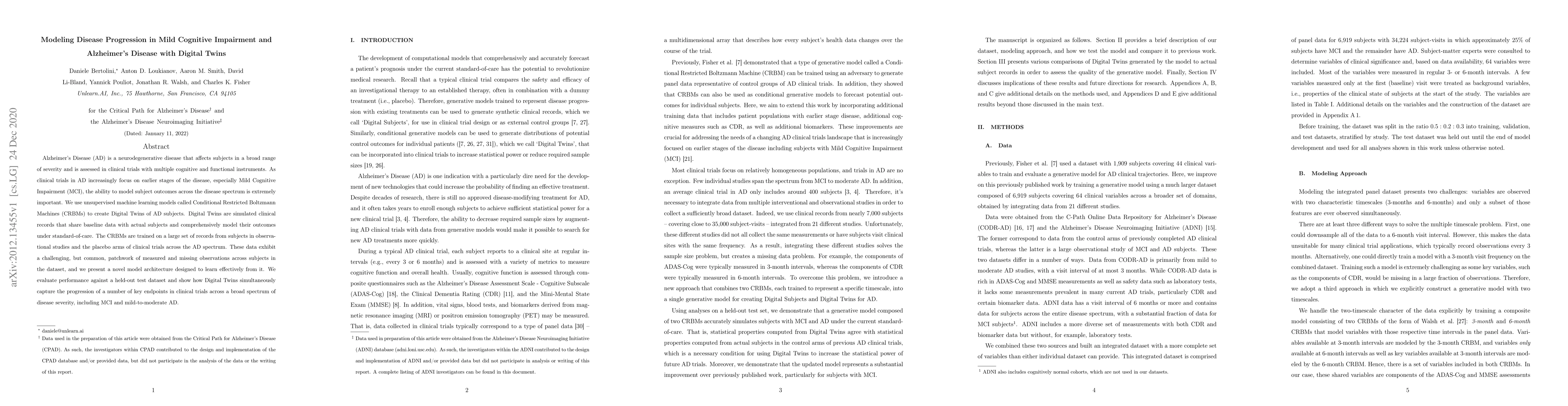 This paper develops Digital Twins using Conditional Restricted Boltzmann Machines (CRBMs) to model the progression of Alzheimer's Disease (AD) and Mild Cognitive Impairment (MCI) from observational studies and clinical trial data. The proposed model effectively handles missing data and accurately predicts key clinical trial endpoints across the disease spectrum.