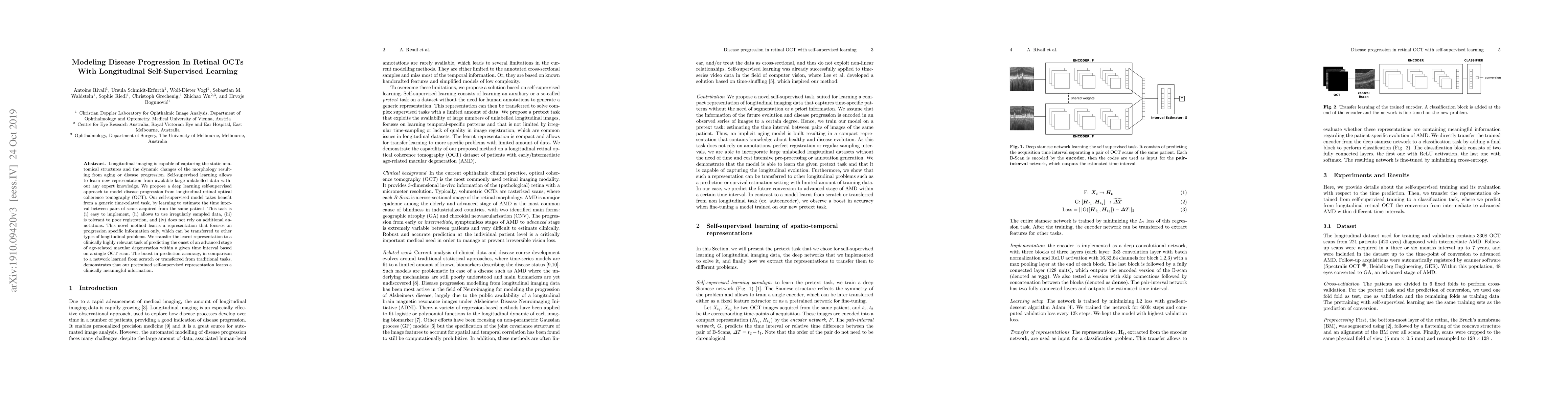 This paper proposes a self-supervised deep learning approach to model disease progression in retinal OCTs using longitudinal imaging data. The method estimates time intervals between scans to learn progression-specific representations, which significantly improve predictions of advanced age-related macular degeneration onset from a single OCT scan.