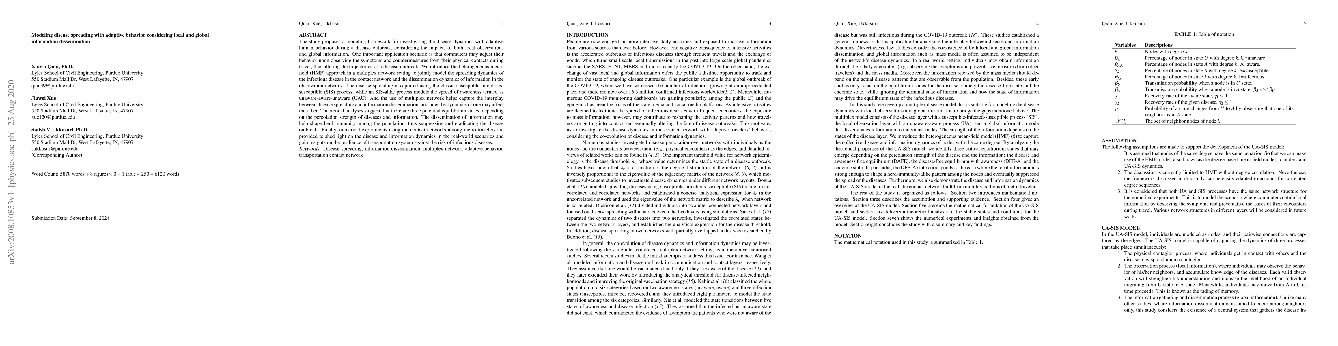 The study proposes a modeling framework for investigating the disease dynamics with adaptive human behavior during a disease outbreak, considering the impacts of both local observations and global information. One important application scenario is that commuters may adjust their behavior upon observing the symptoms and countermeasures from their physical contacts during travel, thus altering the trajectories of a disease outbreak. We introduce the heterogeneous mean-field (HMF) approach in a multiplex network setting to jointly model the spreading dynamics of the infectious disease in the contact network and the dissemination dynamics of information in the observation network. The disease spreading is captured using the classic susceptible-infectious-susceptible (SIS) process, while an SIS-alike process models the spread of awareness termed as unaware-aware-unaware (UAU). And the use of multiplex network helps capture the interplay between disease spreading and information dissemination, and how the dynamics of one may affect the other. Theoretical analyses suggest that there are three potential equilibrium states, depending on the percolation strength of diseases and information. The dissemination of information may help shape herd immunity among the population, thus suppressing and eradicating the disease outbreak. Finally, numerical experiments using the contact networks among metro travelers are provided to shed light on the disease and information dynamics in the real-world scenarios and gain insights on the resilience of transportation system against the risk of infectious diseases.