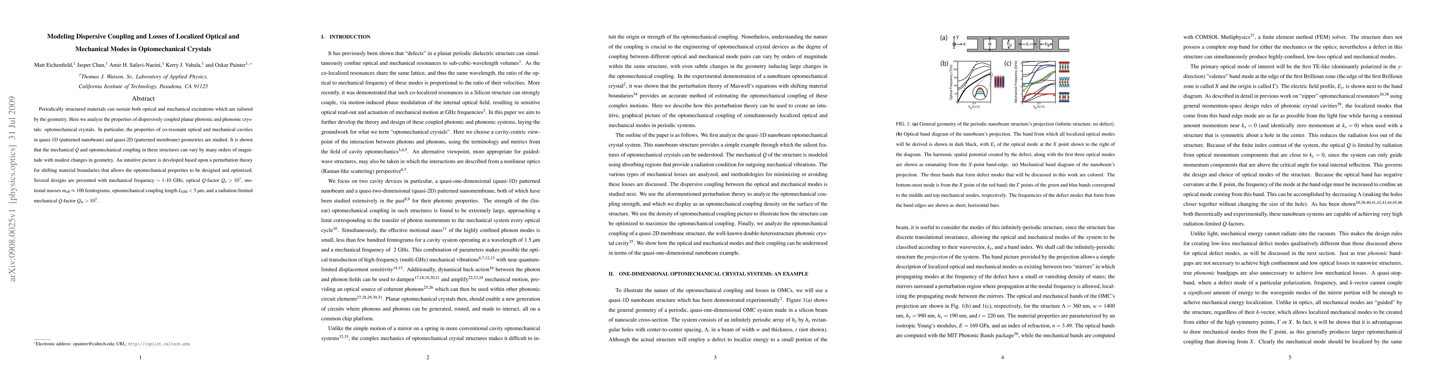 This paper investigates the dispersive coupling and losses in optomechanical crystals, focusing on the properties of photonic and phononic crystals. It demonstrates significant variability in mechanical Q-factors and optomechanical coupling through geometric modifications, presenting designs with high optical and mechanical Q-factors and low motional masses.