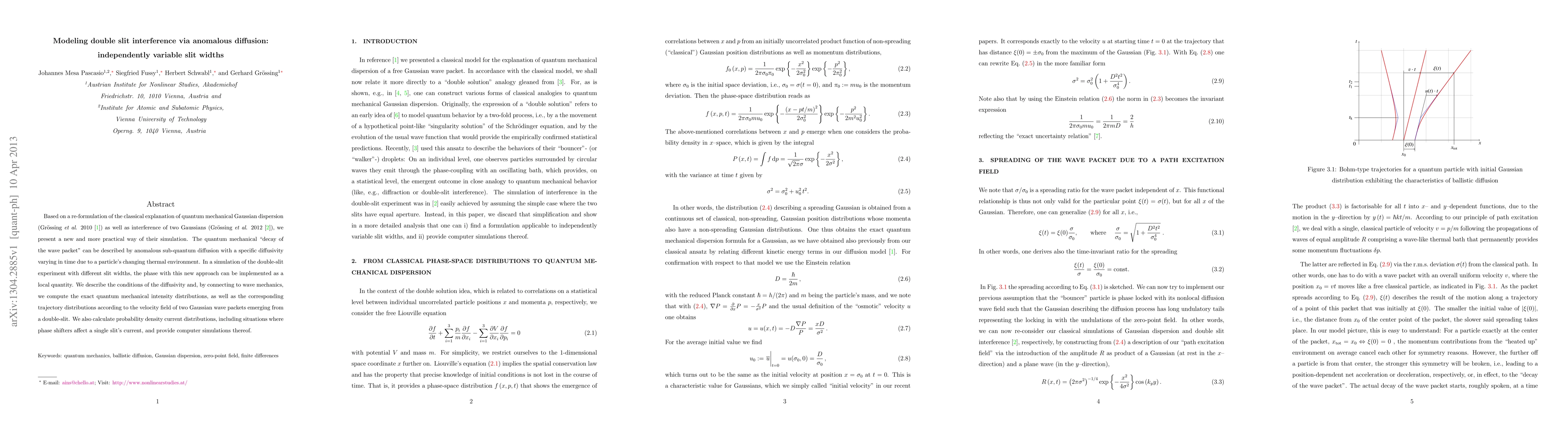 This paper reformulates the classical double slit interference using anomalous diffusion to simulate the quantum mechanical wave packet decay, introducing variable slit widths. It computes exact quantum mechanical intensity and trajectory distributions via a time-varying diffusivity model, and provides computer simulations of probability density current distributions.