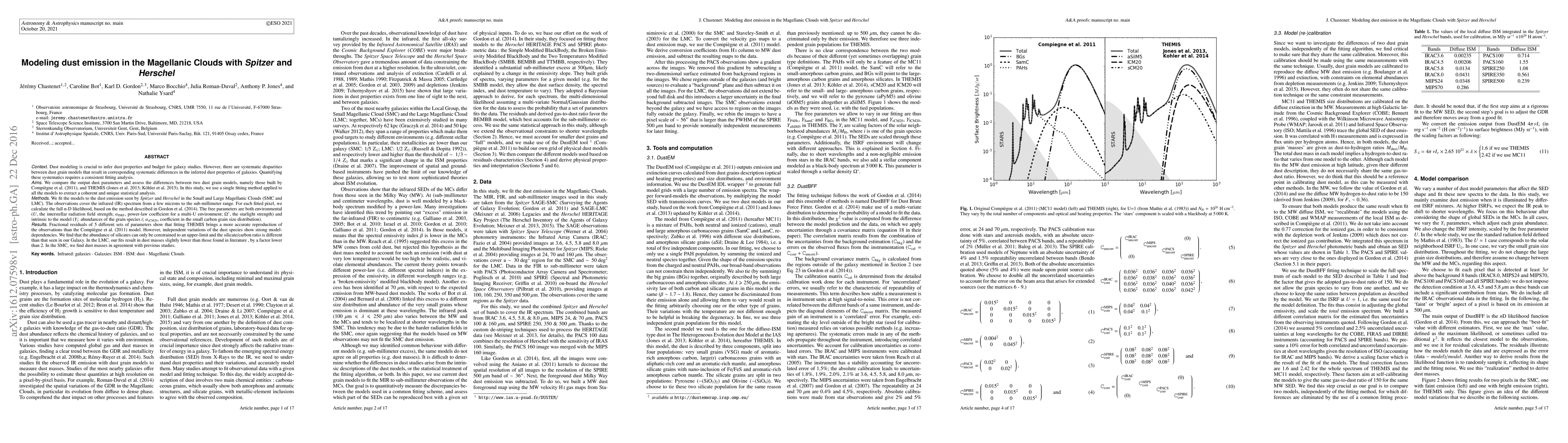 This study compares dust grain models Compiegne et al (2011) and THEMIS (Jones et al 2013, Kohler et al 2015) using Spitzer and Herschel observations of the Magellanic Clouds. The research finds that THEMIS better reproduces observations, but both models show strong model-dependencies in dust species variations. The study concludes that silicate abundance can only be upper-limited and the silicate/carbon ratio differs from our Galaxy, with dust masses in the LMC slightly lower and in the SMC agreeing with previous findings.
