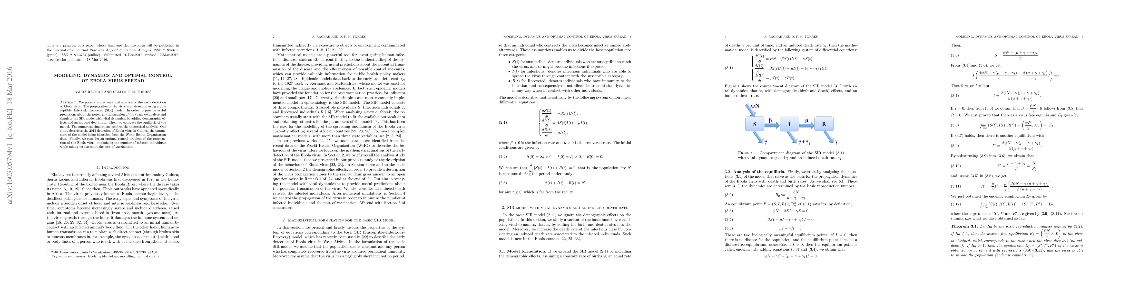 We present a mathematical analysis of the early detection of Ebola virus. The propagation of the virus is analysed by using a Susceptible, Infected, Recovered (SIR) model. In order to provide useful predictions about the potential transmission of the virus, we analyse and simulate the SIR model with vital dynamics, by adding demographic effects and an induced death rate. Then, we compute the equilibria of the model. The numerical simulations confirm the theoretical analysis. Our study describes the 2015 detection of Ebola virus in Guinea, the parameters of the model being identified from the World Health Organization data. Finally, we consider an optimal control problem of the propagation of the Ebola virus, minimizing the number of infected individuals while taking into account the cost of vaccination.