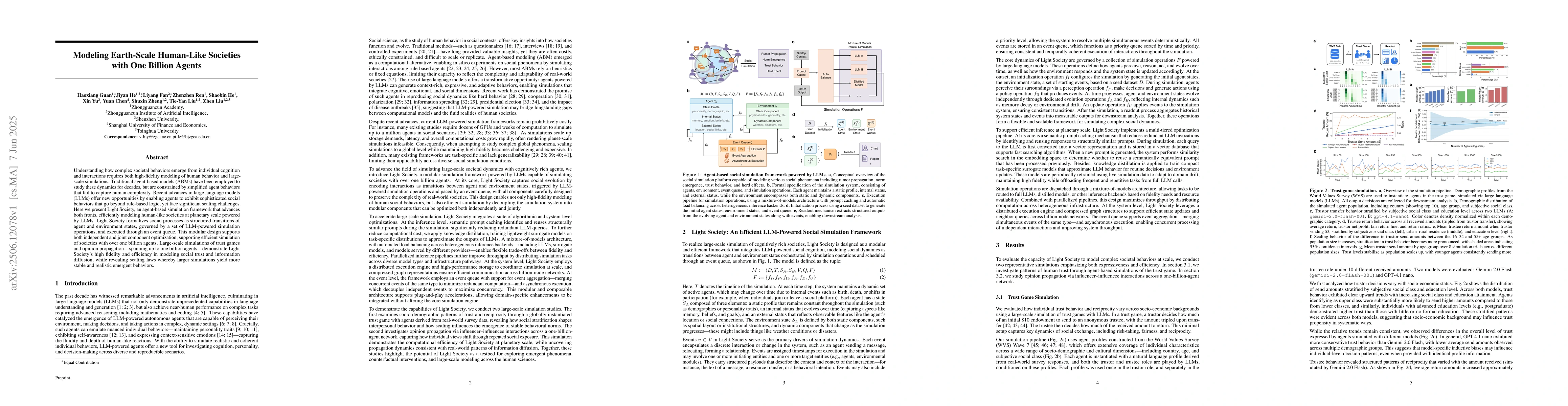 Understanding how complex societal behaviors emerge from individual cognition and interactions requires both high-fidelity modeling of human behavior and large-scale simulations. Traditional agent-based models (ABMs) have been employed to study these dynamics for decades, but are constrained by simplified agent behaviors that fail to capture human complexity. Recent advances in large language models (LLMs) offer new opportunities by enabling agents to exhibit sophisticated social behaviors that go beyond rule-based logic, yet face significant scaling challenges. Here we present Light Society, an agent-based simulation framework that advances both fronts, efficiently modeling human-like societies at planetary scale powered by LLMs. Light Society formalizes social processes as structured transitions of agent and environment states, governed by a set of LLM-powered simulation operations, and executed through an event queue. This modular design supports both independent and joint component optimization, supporting efficient simulation of societies with over one billion agents. Large-scale simulations of trust games and opinion propagation--spanning up to one billion agents--demonstrate Light Society's high fidelity and efficiency in modeling social trust and information diffusion, while revealing scaling laws whereby larger simulations yield more stable and realistic emergent behaviors.