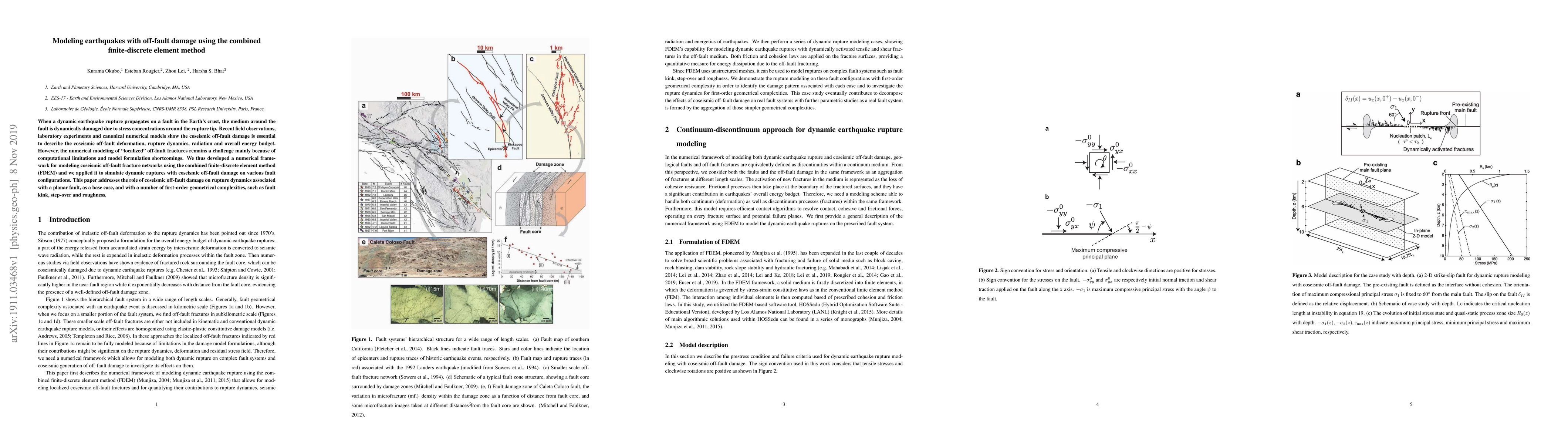 This paper introduces a combined finite-discrete element method (FDEM) to model dynamic earthquake ruptures and the associated coseismic off-fault damage, demonstrating its application to various fault configurations to study rupture dynamics and energy budget. The study highlights the significance of off-fault damage in understanding earthquake mechanics.