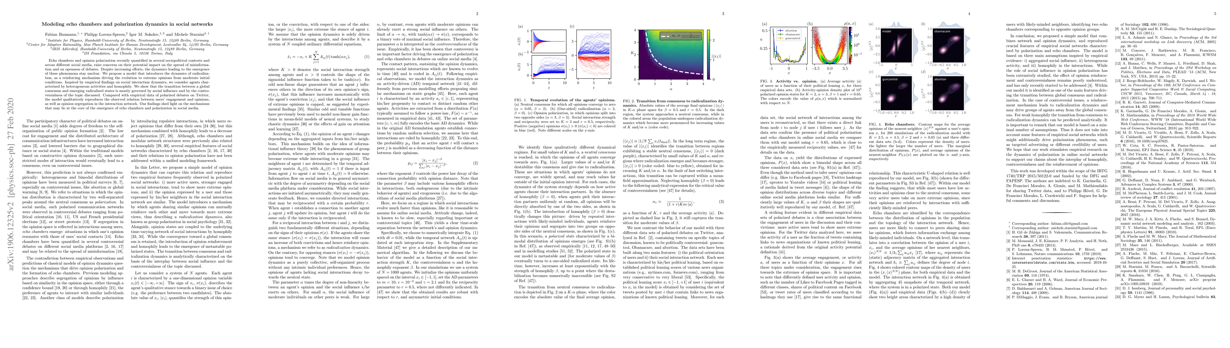 This paper proposes a model to understand the dynamics of echo chambers and opinion polarization in social networks, focusing on the role of social influence and topic controversialness. The model captures the transition from consensus to radicalized opinions, showing good qualitative agreement with empirical data from Twitter.