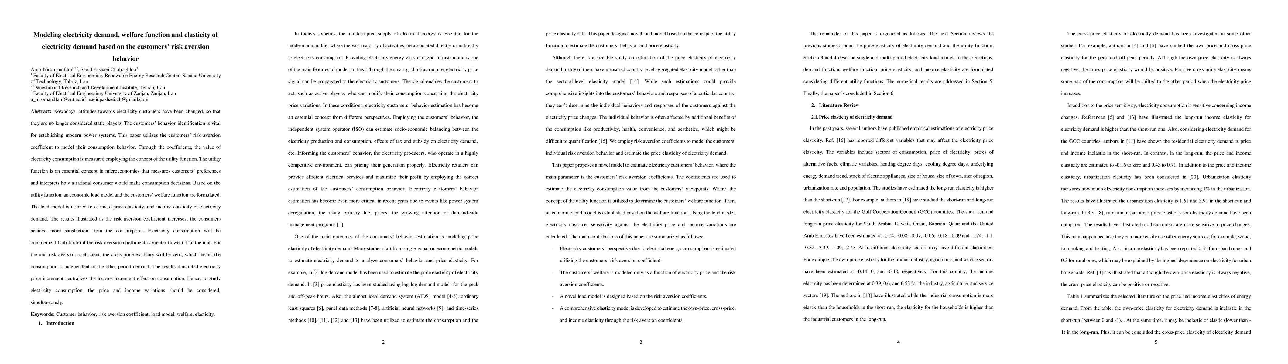 Nowadays, attitudes towards electricity customers have been changed, so that they are no longer considered static players. The customers behavior identification is vital for establishing modern power systems. This paper utilizes the customers risk aversion coefficient to model their consumption behavior. Through the coefficients, the value of electricity consumption is measured employing the concept of the utility function. The utility function is an essential concept in microeconomics that measures customers preferences and interprets how a rational consumer would make consumption decisions. Based on the utility function, an economic load model and the customers welfare function are formulated. The load model is utilized to estimate price elasticity, and income elasticity of electricity demand. The results illustrated as the risk aversion coefficient increases, the consumers achieve more satisfaction from the consumption. Electricity consumption will be complement (substitute) if the risk aversion coefficient is greater (lower) than the unit. For the unit risk aversion coefficient, the cross-price elasticity will be zero, which means the consumption is independent of the other period demand. The results illustrated electricity price increment neutralizes the income increment effect on consumption. Hence, to study electricity consumption, the price and income variations should be considered, simultaneously.