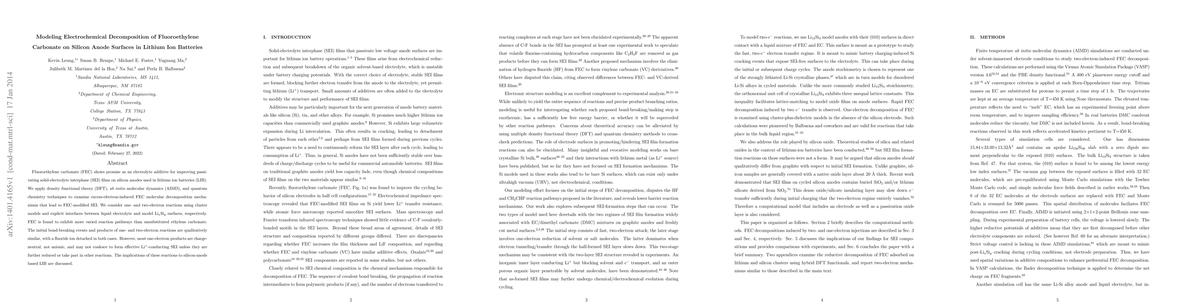 This study uses DFT, AIMD, and quantum chemistry to model the electrochemical decomposition of FEC on silicon anodes, revealing varied reaction pathways leading to modified SEI films. While initial bond-breaking events are similar, one-electron products are charge-neutral, suggesting they may not form effective SEI unless further reduced.