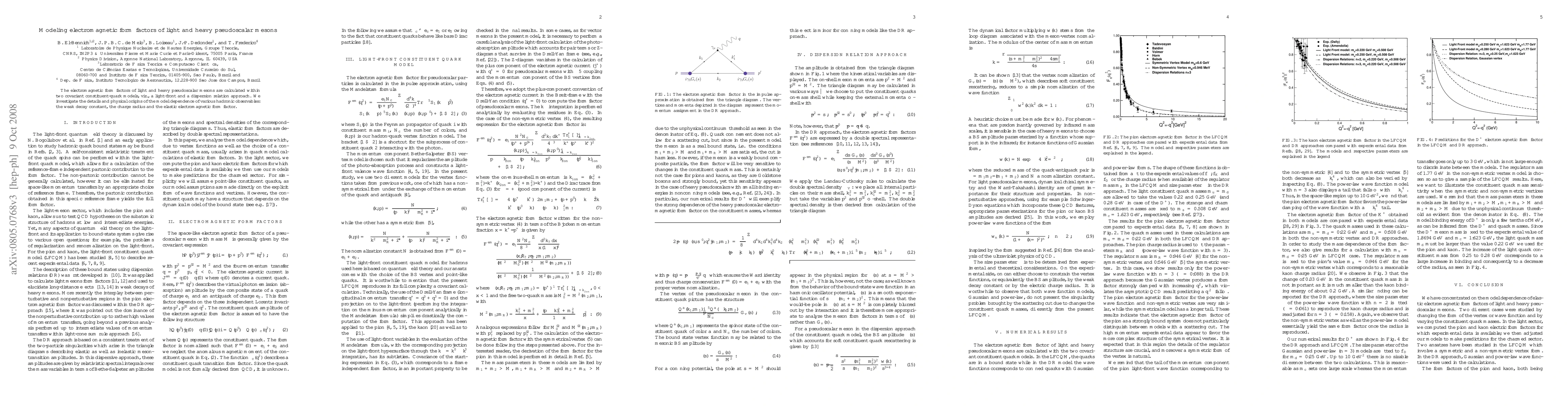 This paper calculates electromagnetic form factors for light and heavy pseudoscalar mesons using two covariant constituent-quark models, comparing results to analyze model dependence in hadronic observables like the weak decay constant, charge radius, and elastic electromagnetic form factor.