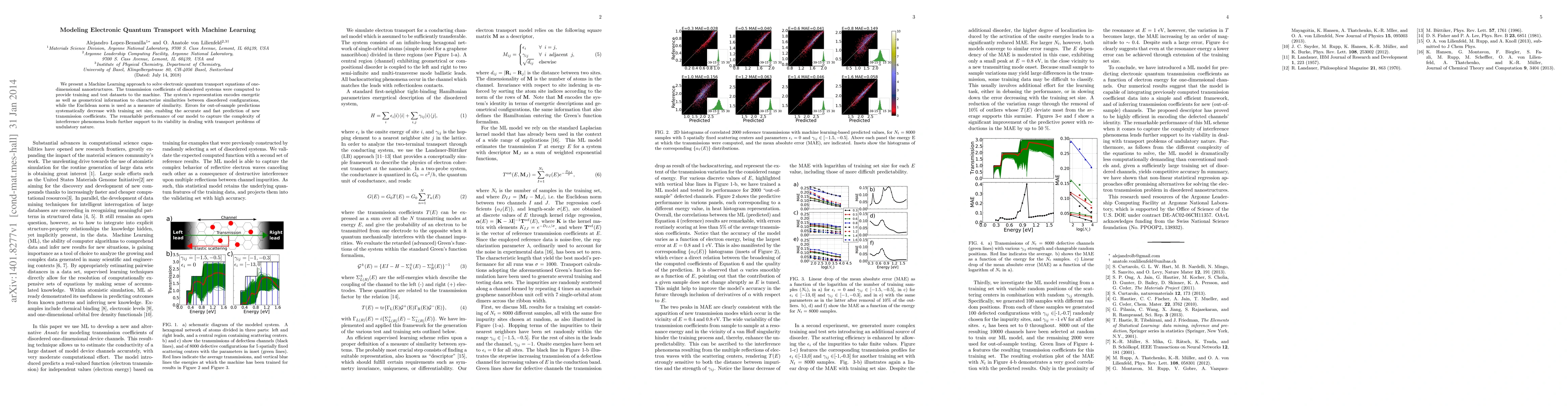 We present a Machine Learning approach to solve electronic quantum transport equations of one-dimensional nanostructures. The transmission coefficients of disordered systems were computed to provide training and test datasets to the machine. The system's representation encodes energetic as well as geometrical information to characterize similarities between disordered configurations, while the Euclidean norm is used as a measure of similarity. Errors for out-of-sample predictions systematically decrease with training set size, enabling the accurate and fast prediction of new transmission coefficients. The remarkable performance of our model to capture the complexity of interference phenomena lends further support to its viability in dealing with transport problems of undulatory nature.