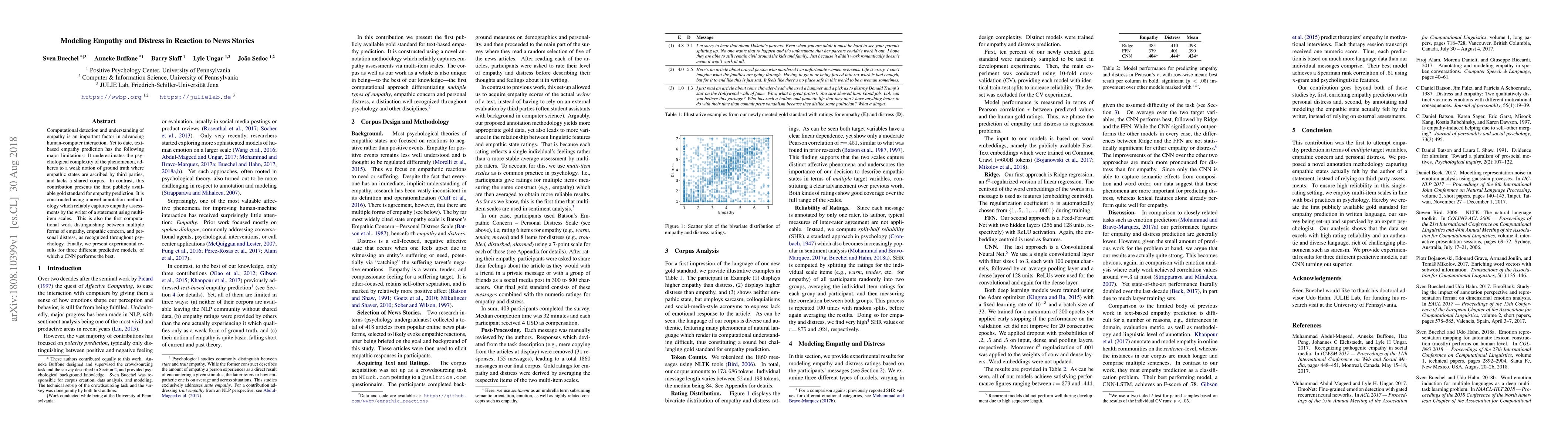 This paper introduces a new gold standard dataset for empathy prediction in text, employing a novel annotation method that captures writer-assessed empathy using multi-item scales. It distinguishes between empathic concern and personal distress, and presents a CNN model that outperforms others in predicting these empathy forms.