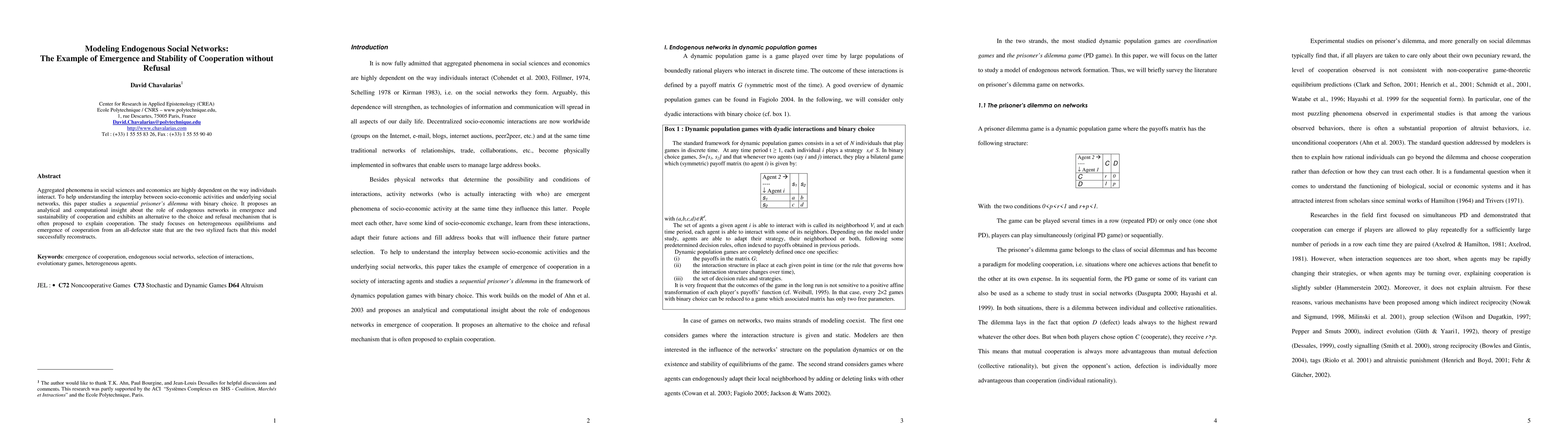 This paper explores how endogenous social networks influence cooperation in a sequential prisoner's dilemma, proposing a model that explains the emergence and stability of cooperation without relying on refusal mechanisms. It highlights the model's ability to reconstruct heterogeneous equilibria and the transition from an all-defector state to cooperation.