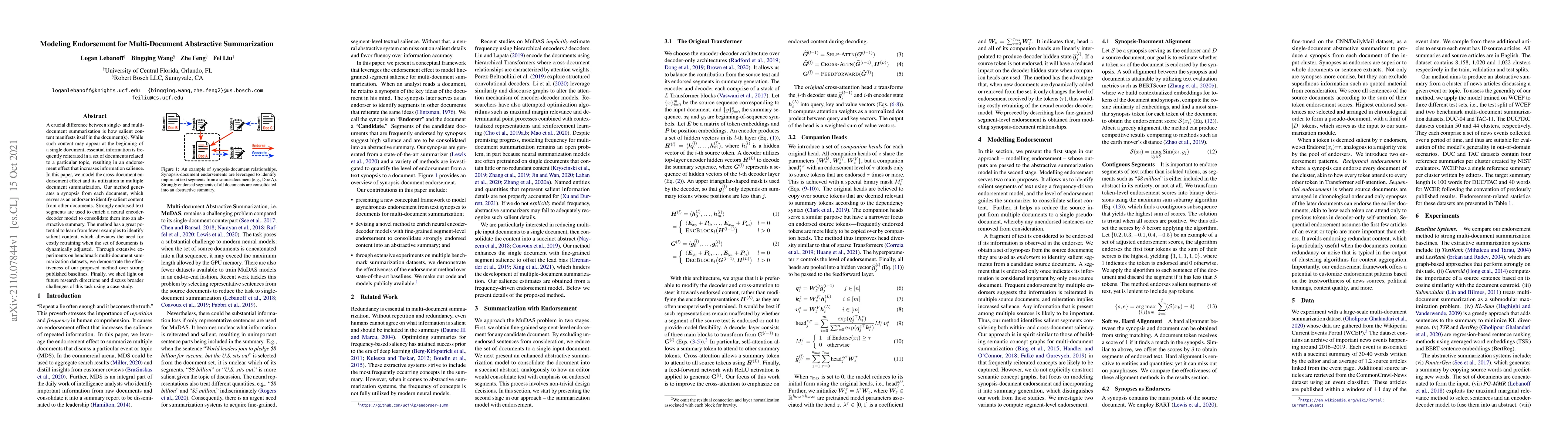 This paper proposes a method to model the cross-document endorsement effect for abstractive summarization of multiple documents, using individual document synopses to identify salient content and enhance a neural encoder-decoder model for the final summary. Experimental results show its effectiveness over existing baselines.