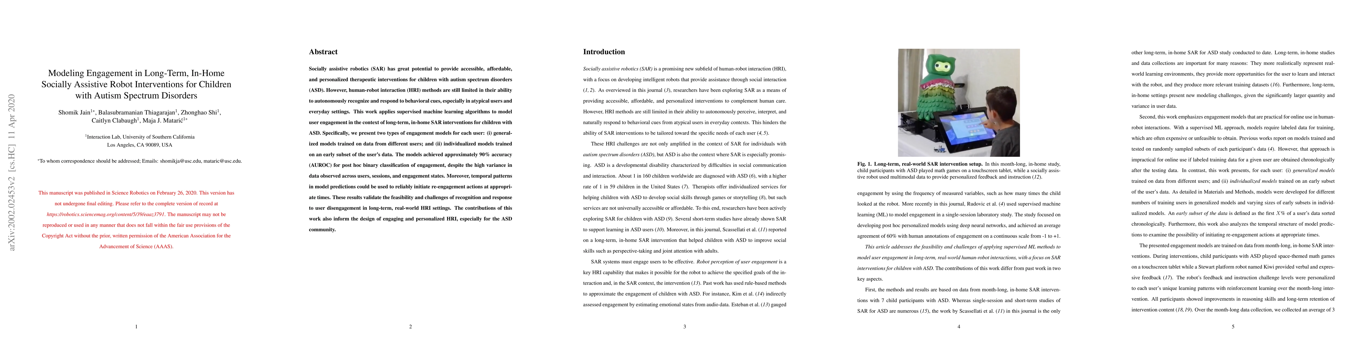 This research develops machine learning models to predict engagement in long-term, in-home socially assistive robot interventions for children with autism spectrum disorders, achieving around 90% accuracy. The study highlights the potential and challenges of using robots to autonomously recognize and respond to user disengagement in everyday settings.