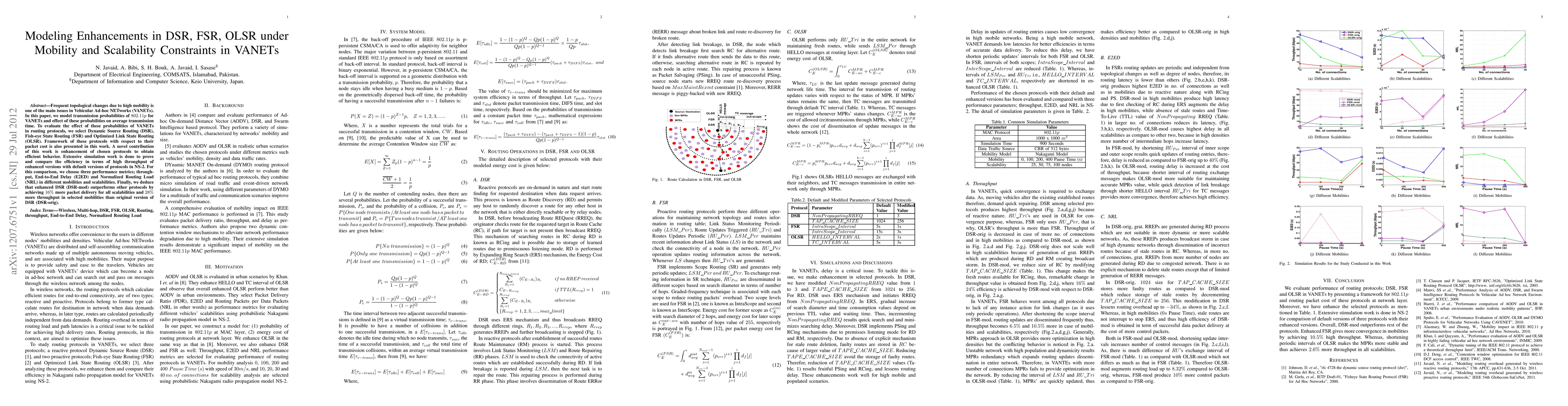 This paper models transmission probabilities in VANETs under mobility and scalability, focusing on enhancing DSR, FSR, and OLSR routing protocols. Enhanced DSR (DSR-mod) shows superior performance in throughput, end-to-end delay, and routing load compared to the original DSR (DSR-orig) and other protocols.