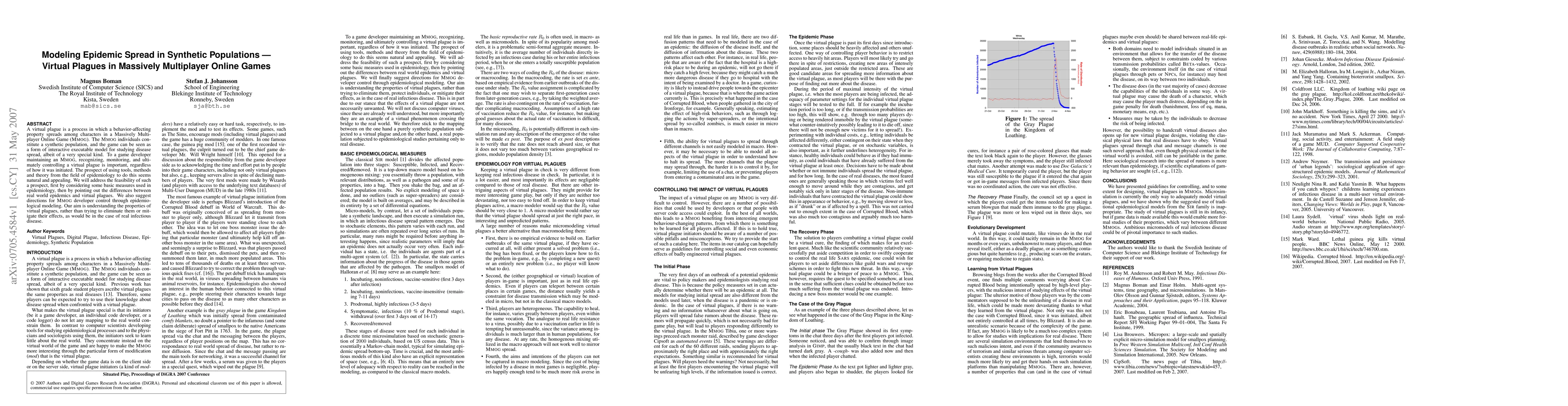 This paper explores the spread of virtual plagues in Massively Multiplayer Online Games (MMOGs) using epidemiological modeling techniques. It examines the differences between real-world epidemics and virtual plagues, aiming to understand their properties rather than mitigate them, and suggests methods for MMOG developers to monitor and control these virtual outbreaks.