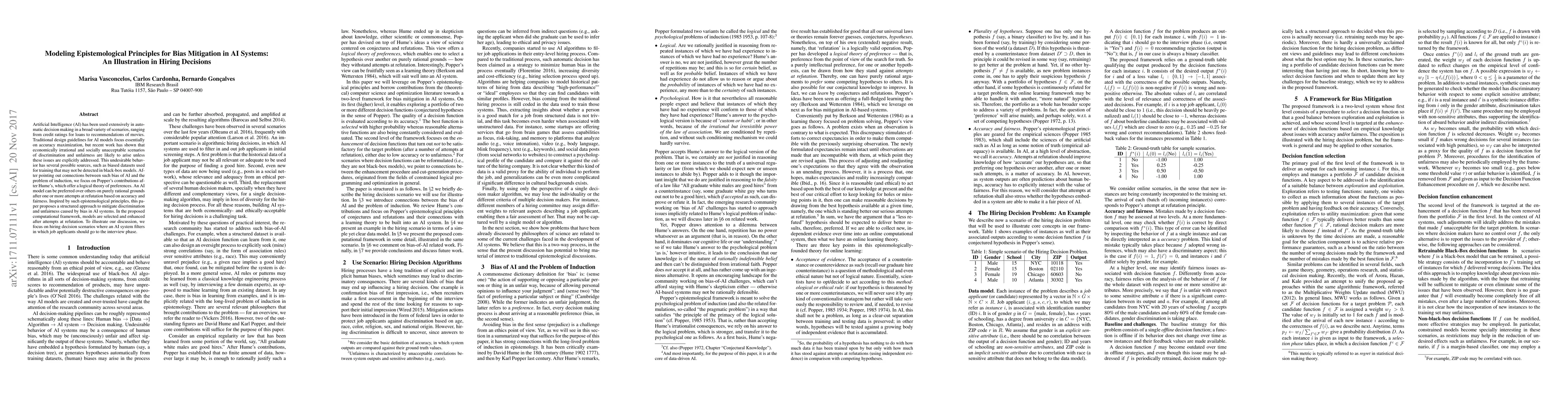 This paper proposes an epistemological framework inspired by Popper's theory of preferences to mitigate bias in AI systems, focusing on fairness and accuracy. It illustrates the approach in hiring decisions, where AI filters applicants, aiming to address discrimination and unfairness.