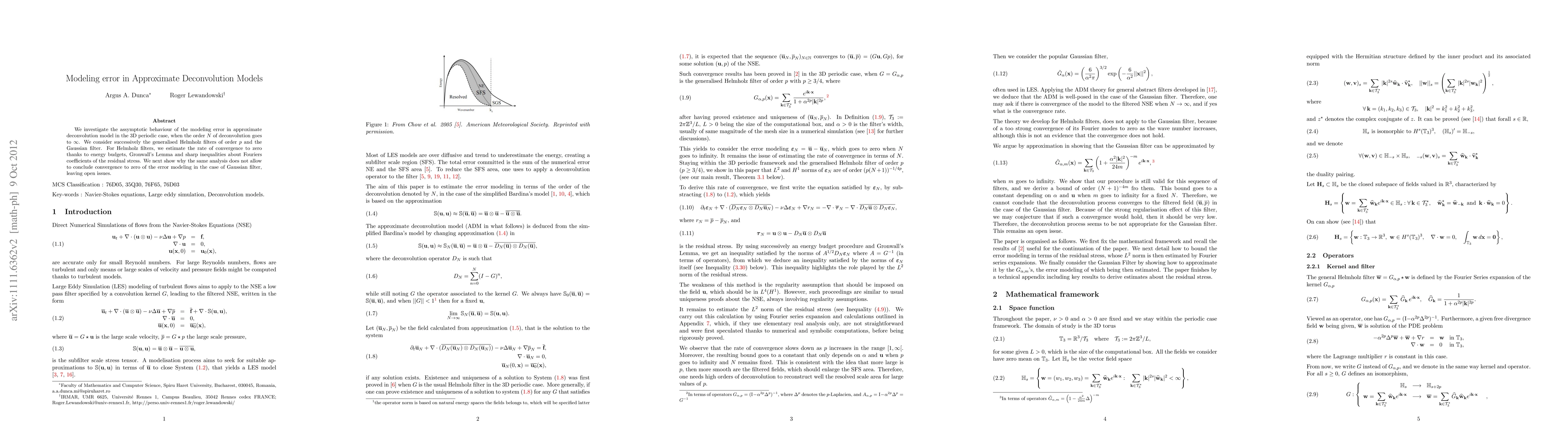 We investigate the assymptotic behaviour of the modeling error in approximate deconvolution model in the 3D periodic case, when the order $N$ of deconvolution goes to $\infty$. We consider successively the generalised Helmholz filters of order $p$ and the Gaussian filter. For Helmholz filters, we estimate the rate of convergence to zero thanks to energy budgets, Gronwall's Lemma and sharp inequalities about Fouriers coefficients of the residual stress. We next show why the same analysis does not allow to conclude convergence to zero of the error modeling in the case of Gaussian filter, leaving open issues.