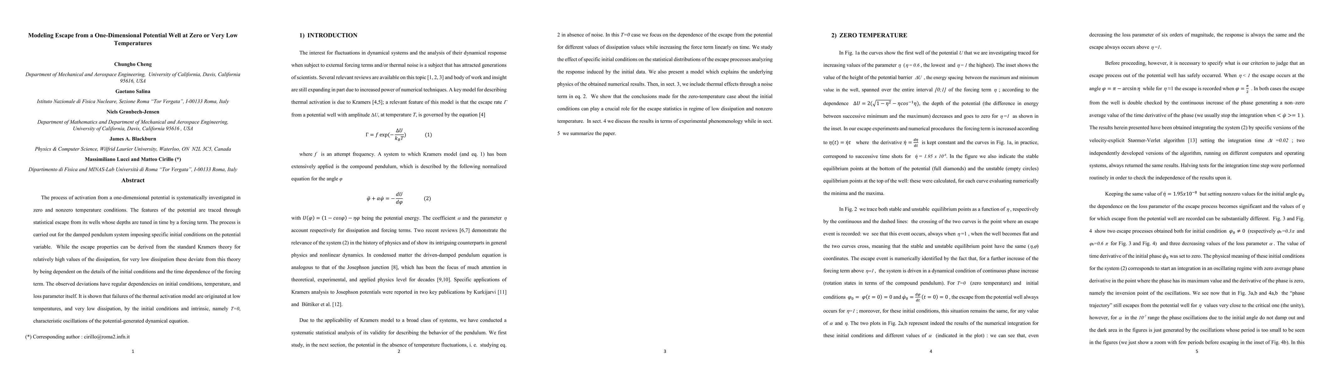 The paper presents a detailed numerical analysis of potential escape from a one-dimensional potential well at low temperatures, identifying a critical threshold (κ=α̇=1) that differentiates the system's response and highlighting the importance of initial conditions in underdamped regimes.