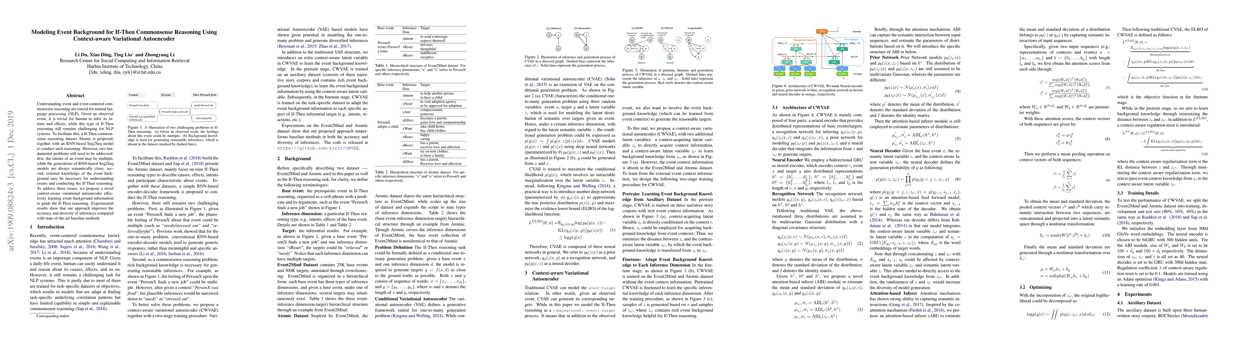 This paper proposes a context-aware variational autoencoder to model event background information for enhancing If-Then commonsense reasoning in NLP. The approach improves the accuracy and diversity of event intent and effect inferences compared to existing RNN-based Seq2Seq models.
