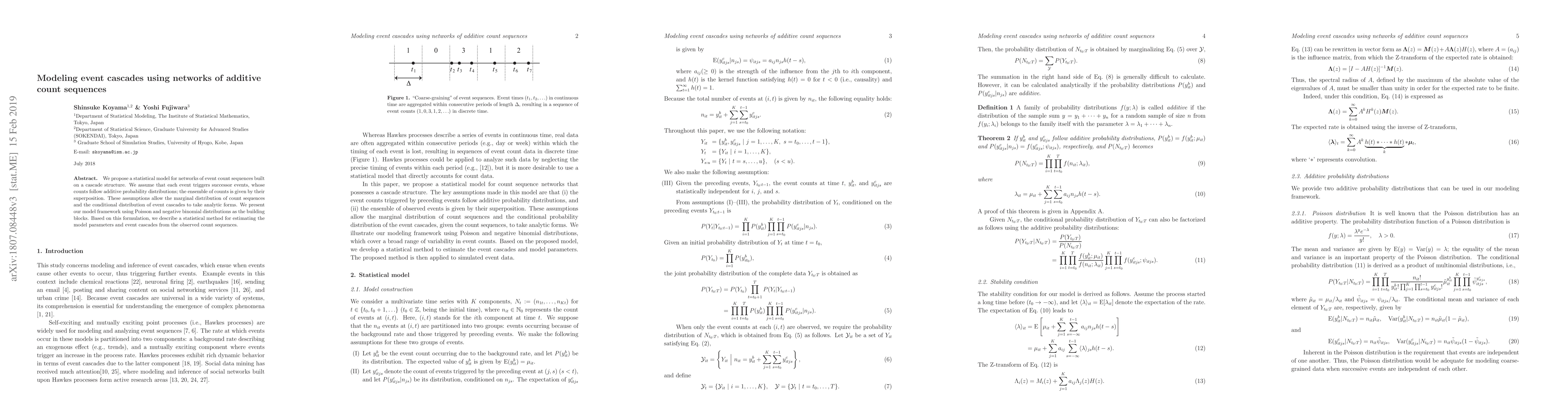 This paper introduces a statistical model for networks of event count sequences based on a cascade structure, where each event triggers successor events following additive probability distributions. The model uses Poisson and negative binomial distributions to analytically describe the marginal and conditional distributions, and provides a method for estimating parameters and event cascades.