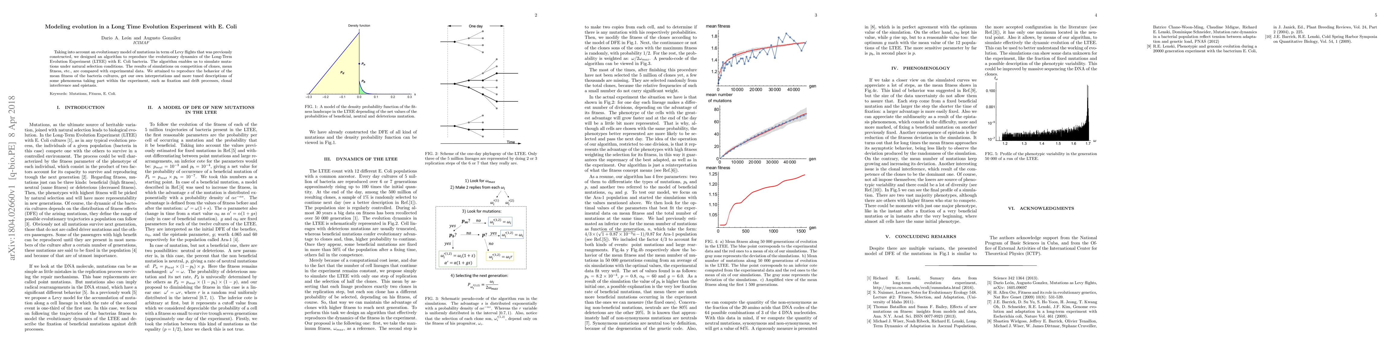Taking into account an evolutionary model of mutations in term of Levy Fights that was previously constructed, we designed an algorithm to reproduce the evolutionary dynamics of the Long-Term Evolution Experiment (LTEE) with E. Coli bacteria. The algorithm enables us to simulate mutations under natural selection conditions. The results of simulations on competition of clones, mean fitness, etc., are compared with experimental data. We attained to reproduce the behavior of the mean fitness of the bacteria cultures, get our own interpretations and more tuned descriptions of some phenomena taking part within the experiment, such as fixation and drift processes, clonal interference and epistasis.