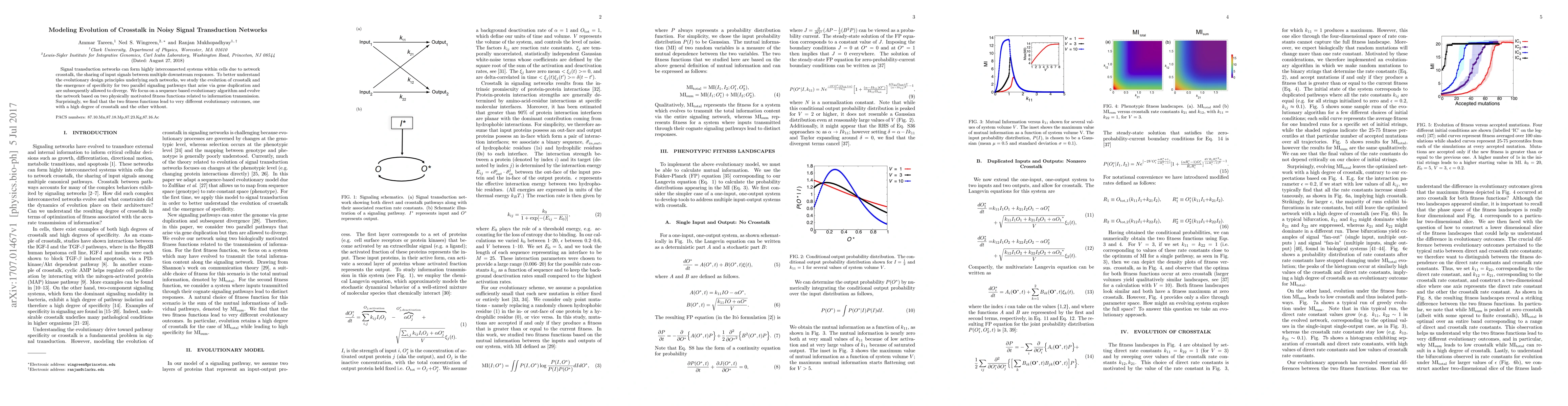 This research models the evolution of crosstalk in noisy signal transduction networks, focusing on the divergence of two parallel pathways via gene duplication. The study employs a sequence-based evolutionary algorithm with two fitness functions, revealing distinct evolutionary outcomes: one with significant crosstalk and the other with minimal crosstalk.