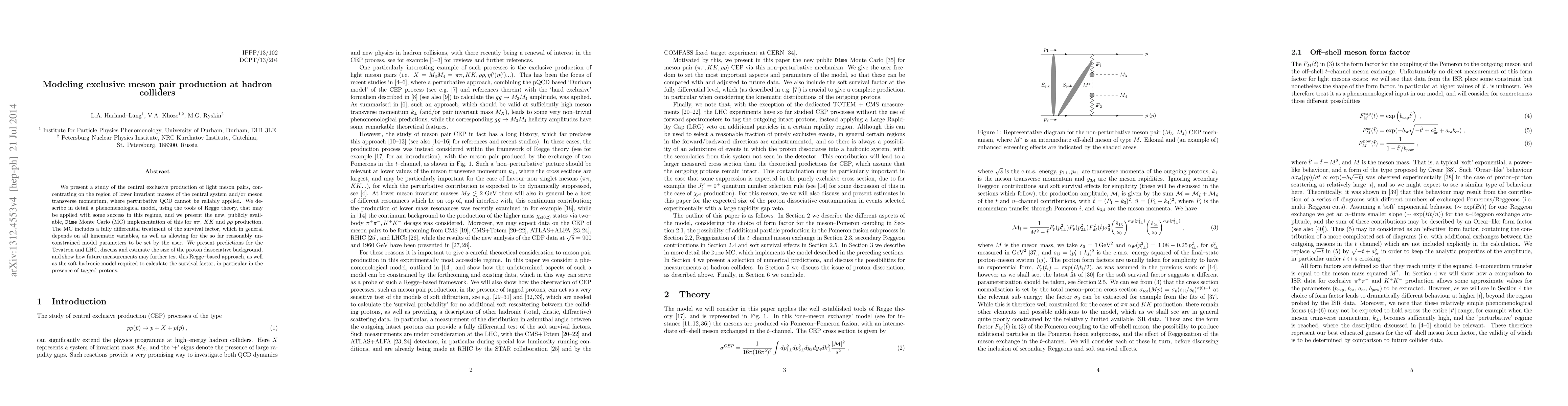 This paper develops a phenomenological model based on Regge theory to study exclusive meson pair production at hadron colliders, particularly in regions where perturbative QCD fails. It introduces a new Monte Carlo implementation, Dime, for $\pi\pi$, $KK$, and $\rho\rho$ production, and provides predictions for future measurements at the Tevatron and LHC.