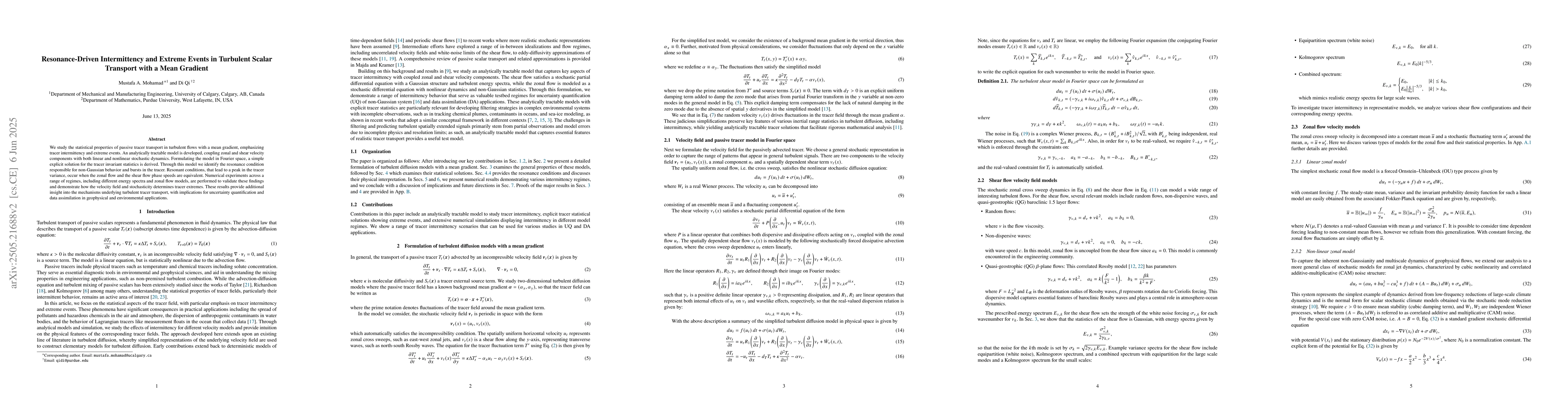 This study models turbulent diffusion with a mean gradient to understand tracer intermittency and extreme events, identifying resonance conditions that lead to non-Gaussian behavior and bursts in the tracer.