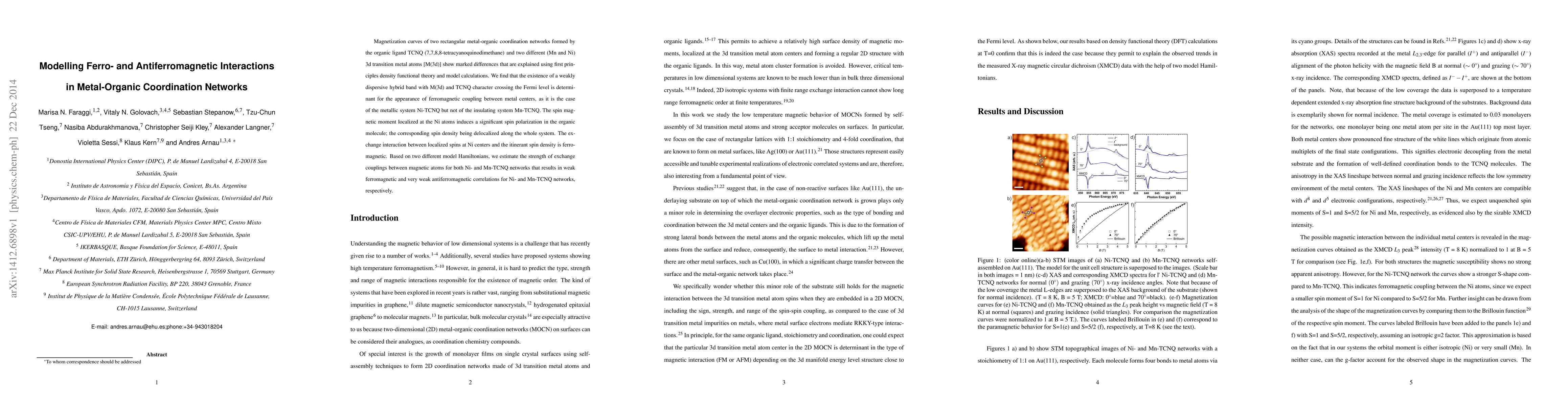 This study employs first principles density functional theory to explain the differing ferromagnetic and antiferromagnetic interactions in metal-organic coordination networks formed with TCNQ and Mn or Ni metal centers. The presence of a hybrid band crossing the Fermi level in the Ni-TCNQ system leads to ferromagnetic coupling, while the Mn-TCNQ system shows weak antiferromagnetic correlations.