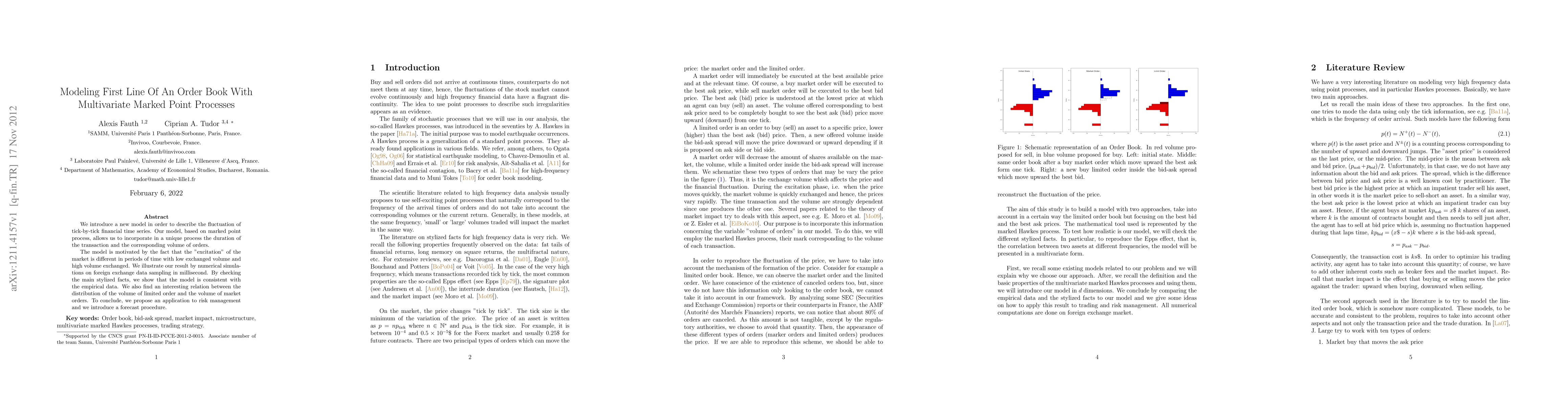 We introduce a new model in order to describe the fluctuation of tick-by-tick financial time series. Our model, based on marked point process, allows us to incorporate in a unique process the duration of the transaction and the corresponding volume of orders. The model is motivated by the fact that the "excitation" of the market is different in periods of time with low exchanged volume and high volume exchanged. We illustrate our result by numerical simulations on foreign exchange data sampling in millisecond. By checking the main stylized facts, we show that the model is consistent with the empirical data. We also find an interesting relation between the distribution of the volume of limited order and the volume of market orders. To conclude, we propose an application to risk management and we introduce a forecast procedure.
