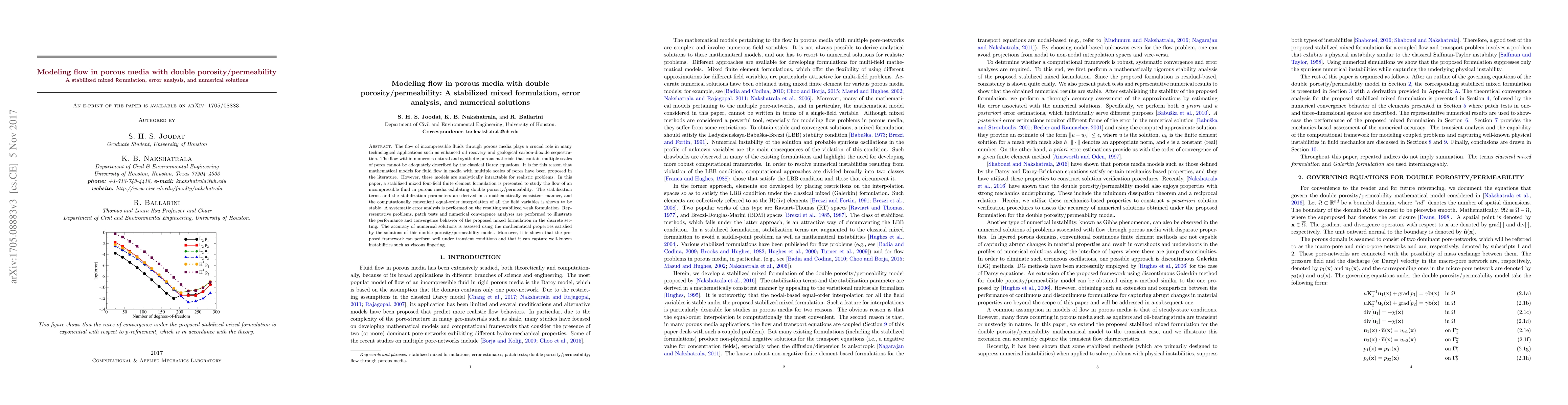This paper presents a stabilized mixed finite element formulation for modeling fluid flow in porous media with double porosity/permeability, including error analysis and numerical solutions. It demonstrates the stability of equal-order interpolation, assesses numerical accuracy, and shows the framework's ability to capture transient behaviors and instabilities like viscous fingering.