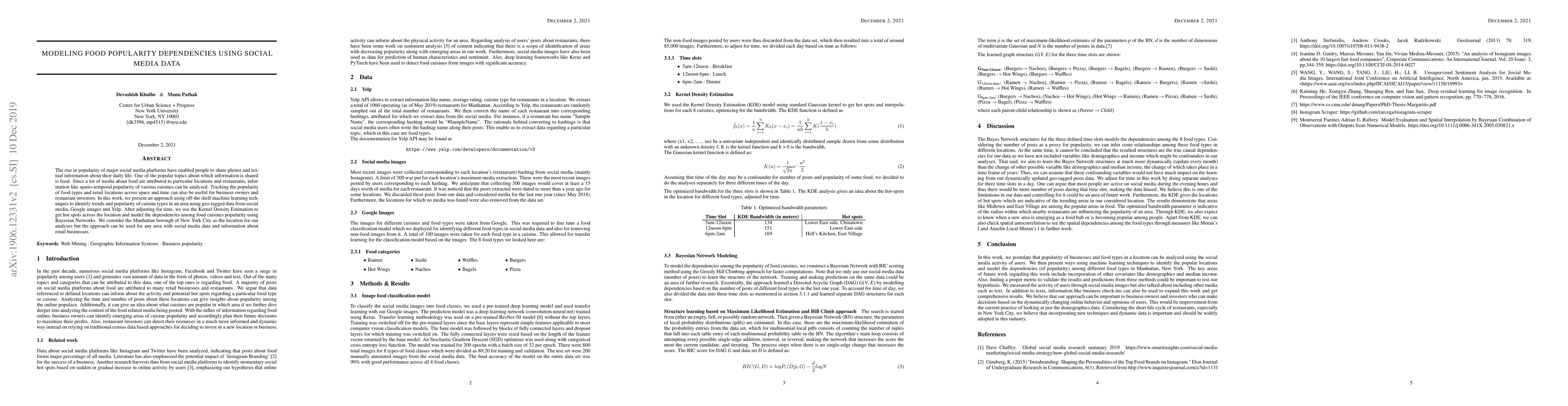 The rise in popularity of major social media platforms have enabled people to share photos and textual information about their daily life. One of the popular topics about which information is shared is food. Since a lot of media about food are attributed to particular locations and restaurants, information like spatio-temporal popularity of various cuisines can be analyzed. Tracking the popularity of food types and retail locations across space and time can also be useful for business owners and restaurant investors. In this work, we present an approach using off-the shelf machine learning techniques to identify trends and popularity of cuisine types in an area using geo-tagged data from social media, Google images and Yelp. After adjusting for time, we use the Kernel Density Estimation to get hot spots across the location and model the dependencies among food cuisines popularity using Bayesian Networks. We consider the Manhattan borough of New York City as the location for our analyses but the approach can be used for any area with social media data and information about retail businesses.