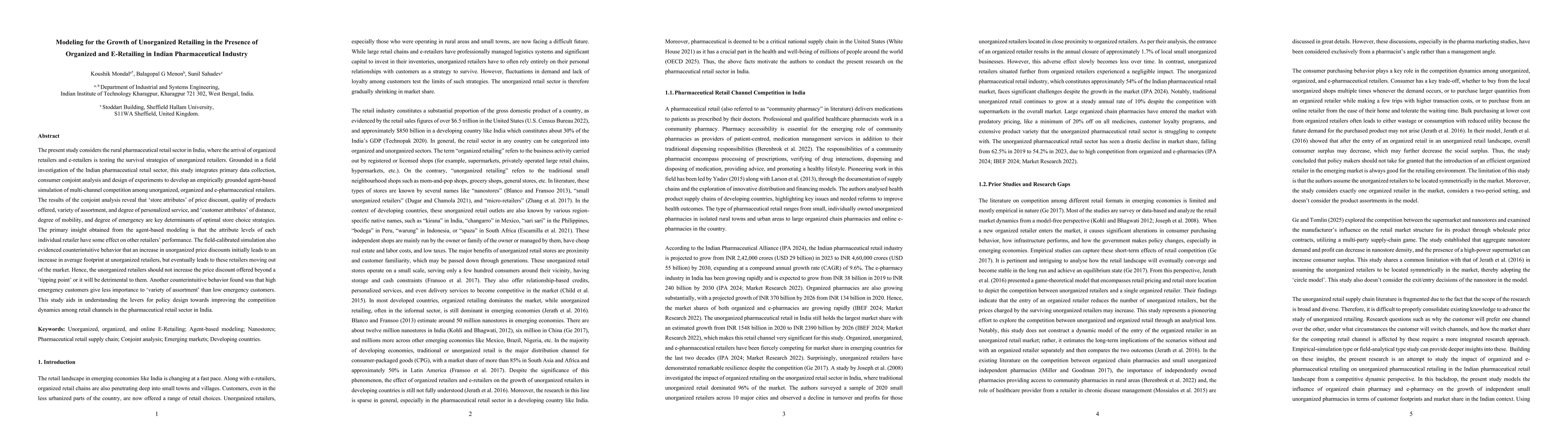 The present study considers the rural pharmaceutical retail sector in India, where the arrival of organized retailers and e-retailers is testing the survival strategies of unorganized retailers. Grounded in a field investigation of the Indian pharmaceutical retail sector, this study integrates primary data collection, consumer conjoint analysis and design of experiments to develop an empirically grounded agent-based simulation of multi-channel competition among unorganized, organized and e-pharmaceutical retailers. The results of the conjoint analysis reveal that store attributes of price discount, quality of products offered, variety of assortment, and degree of personalized service, and customer attributes of distance, degree of mobility, and degree of emergency are key determinants of optimal store choice strategies. The primary insight obtained from the agent-based modeling is that the attribute levels of each individual retailer have some effect on other retailers performance. The field-calibrated simulation also evidenced counterintuitive behavior that an increase in unorganized price discounts initially leads to an increase in average footprint at unorganized retailers, but eventually leads to these retailers moving out of the market. Hence, the unorganized retailers should not increase the price discount offered beyond a tipping point or it will be detrimental to them. Another counterintuitive behavior found was that high emergency customers give less importance to variety of assortment than low emergency customers. This study aids in understanding the levers for policy design towards improving the competition dynamics among retail channels in the pharmaceutical retail sector in India.
