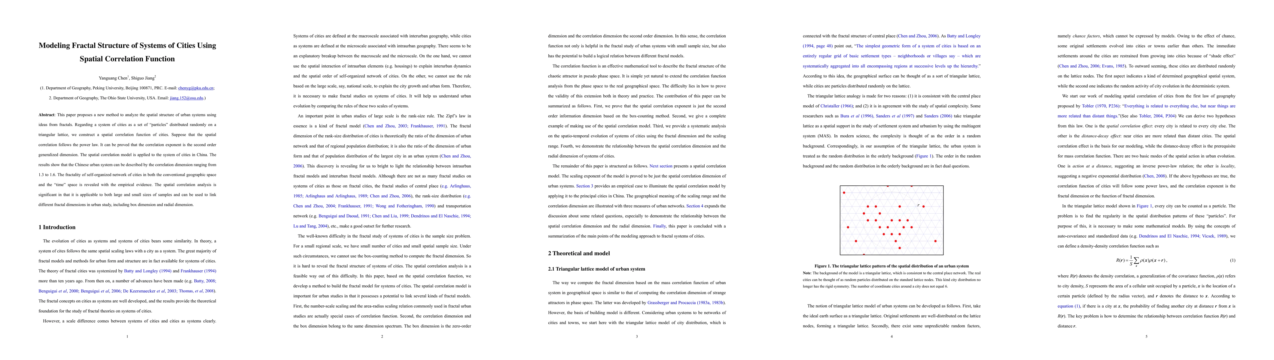 This paper proposes a new method to analyze the spatial structure of urban systems using ideas from fractals. Regarding a system of cities as a set of "particles" distributed randomly on a triangular lattice, we construct a spatial correlation function of cities. Suppose that the spatial correlation follows the power law. It can be proved that the correlation exponent is the second order generalized dimension. The spatial correlation model is applied to the system of cities in China. The results show that the Chinese urban system can be described by the correlation dimension ranging from 1.3 to 1.6. The fractality of self-organized network of cities in both the conventional geographic space and the "time" space is revealed with the empirical evidence. The spatial correlation analysis is significant in that it is applicable to both large and small sizes of samples and can be used to link different fractal dimensions in urban study, including box dimension and radial dimension.