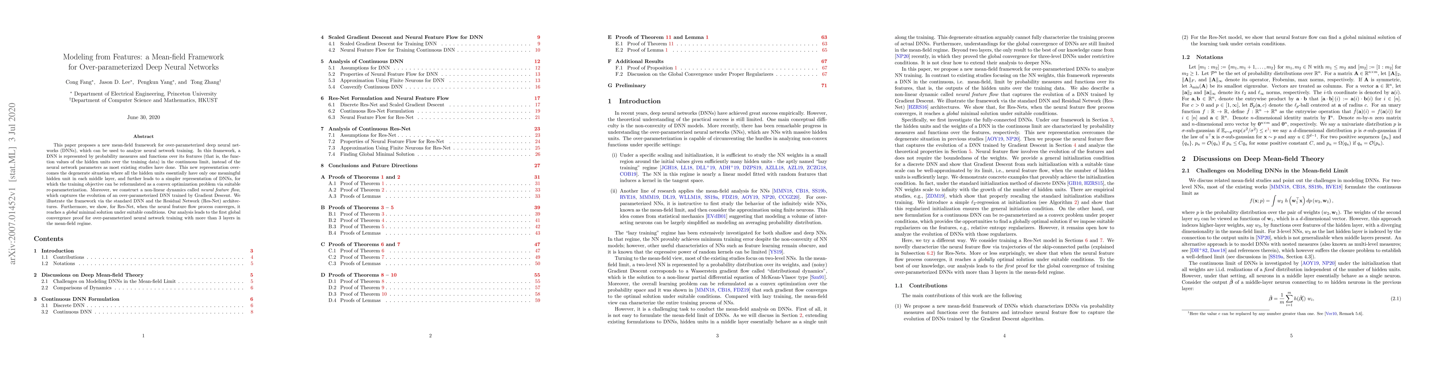 This paper introduces a mean-field framework for analyzing over-parameterized deep neural networks, representing them via probability measures over features instead of parameters, leading to a simpler representation and a global convergence proof for training. The framework also constructs a neural feature flow to model the training dynamics.
