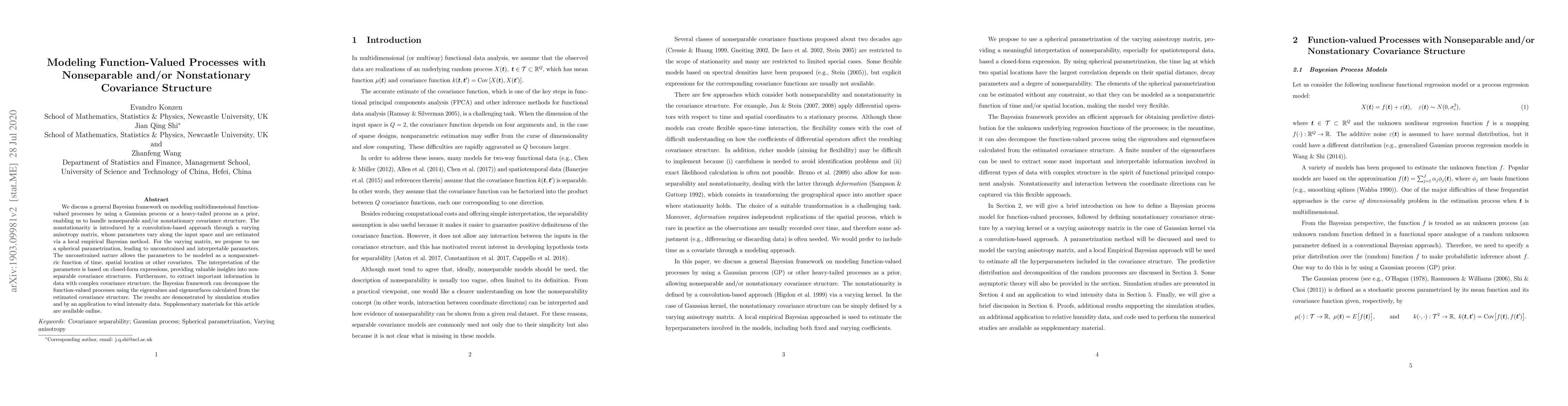 This paper proposes a Bayesian framework for modeling multidimensional function-valued processes with nonseparable and nonstationary covariance structures using Gaussian or heavy-tailed processes. It introduces nonstationarity via a convolution-based approach with a varying anisotropy matrix, estimated through a local empirical Bayesian method, and interprets parameters using spherical parametrization.