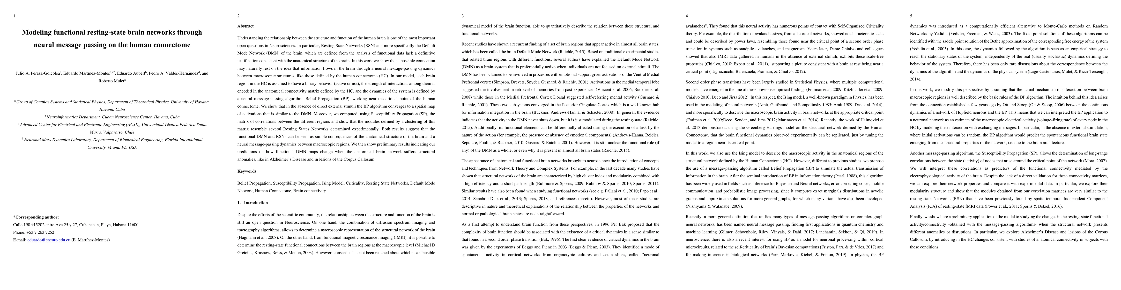 Understanding the relationship between the structure and function of the human brain is one of the most important open questions in Neurosciences. In particular, Resting State Networks (RSN) and more specifically the Default Mode Network (DMN) of the brain, which are defined from the analysis of functional data lack a definitive justification consistent with the anatomical structure of the brain. In this work, we show that a possible connection may naturally rest on the idea that information flows in the brain through a neural message-passing dynamics between macroscopic structures, like those defined by the human connectome (HC). In our model, each brain region in the HC is assumed to have a binary behavior (active or not), the strength of interactions among them is encoded in the anatomical connectivity matrix defined by the HC, and the dynamics of the system is defined by a neural message-passing algorithm, Belief Propagation (BP), working near the critical point of the human connectome. We show that in the absence of direct external stimuli the BP algorithm converges to a spatial map of activations that is similar to the DMN. Moreover, we computed, using Susceptibility Propagation (SP), the matrix of correlations between the different regions and show that the modules defined by a clustering of this matrix resemble several Resting States Networks determined experimentally. Both results suggest that the functional DMN and RSNs can be seen as simple consequences of the anatomical structure of the brain and a neural message-passing dynamics between macroscopic regions. We then show preliminary results indicating our predictions on how functional DMN maps change when the anatomical brain network suffers structural anomalies, like in Alzheimers Disease and in lesions of the Corpus Callosum.
