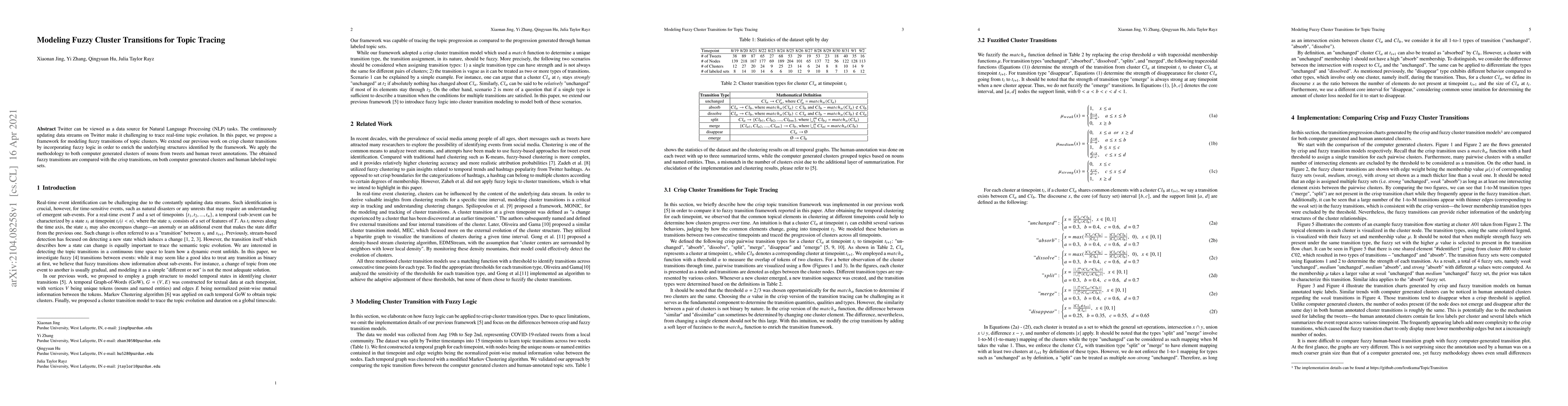 Researchers developed a framework to model fuzzy transitions of topic clusters on Twitter data, improving accuracy in real-time topic evolution tracing. The study compared fuzzy transitions with crisp ones, showing enhanced performance in both computer-generated and human-annotated datasets.