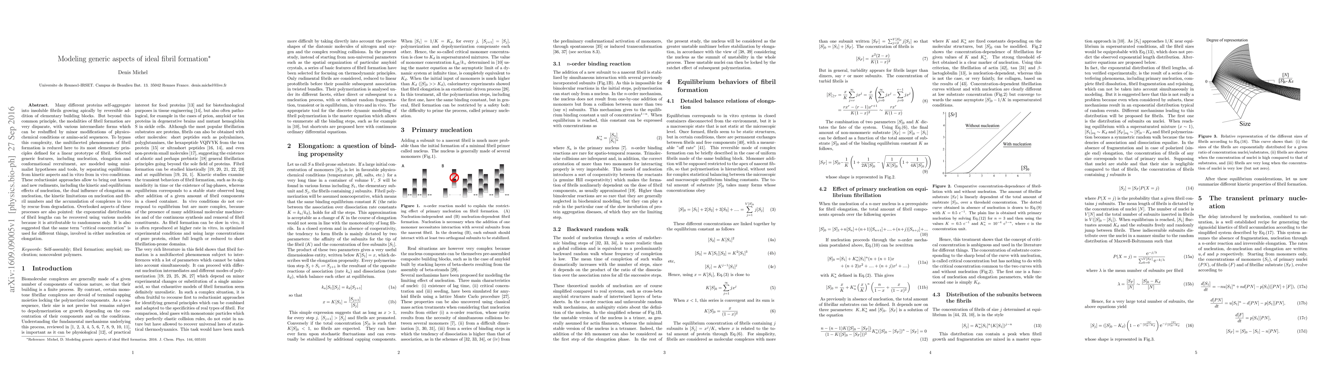 Many different proteins self-aggregate into insoluble fibrils growing apically by reversible addition of elementary building blocks. But beyond this common principle, the modalities of fibril formation are very disparate, with various intermediate forms which can be reshuffled by minor modifications of physico-chemical conditions or amino-acid sequences. To bypass this complexity, the multifaceted phenomenon of fibril formation is reduced here to its most elementary principles defined for a linear prototype of fibril. Selected generic features, including nucleation, elongation and conformational recruitment, are modeled using minimalist hypotheses and tools, by separating equilibrium from kinetic aspects and in vitro from in vivo conditions. These reductionist approaches allow to bring out known and new rudiments, including the kinetic and equilibrium effects of nucleation, the dual influence of elongation on nucleation, the kinetic limitations on nucleation and fibril numbers and the accumulation of complexes in vivo by rescue from degradation. Overlooked aspects of these processes are also pointed: the exponential distribution of fibril lengths can be recovered using various models because it is attributable to randomness only. It is also suggested that the same term "critical concentration" is used for different things, involved in either nucleation or elongation.