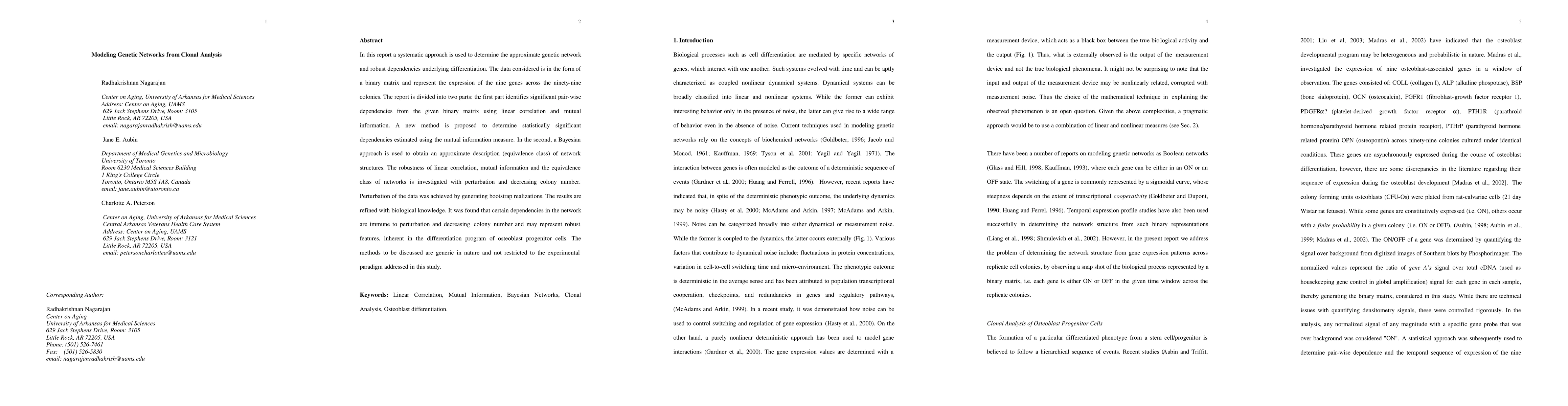 In this report a systematic approach is used to determine the approximate genetic network and robust dependencies underlying differentiation. The data considered is in the form of a binary matrix and represent the expression of the nine genes across the ninety-nine colonies. The report is divided into two parts: the first part identifies significant pair-wise dependencies from the given binary matrix using linear correlation and mutual information. A new method is proposed to determine statistically significant dependencies estimated using the mutual information measure. In the second, a Bayesian approach is used to obtain an approximate description (equivalence class) of network structures. The robustness of linear correlation, mutual information and the equivalence class of networks is investigated with perturbation and decreasing colony number. Perturbation of the data was achieved by generating bootstrap realizations. The results are refined with biological knowledge. It was found that certain dependencies in the network are immune to perturbation and decreasing colony number and may represent robust features, inherent in the differentiation program of osteoblast progenitor cells. The methods to be discussed are generic in nature and not restricted to the experimental paradigm addressed in this study.