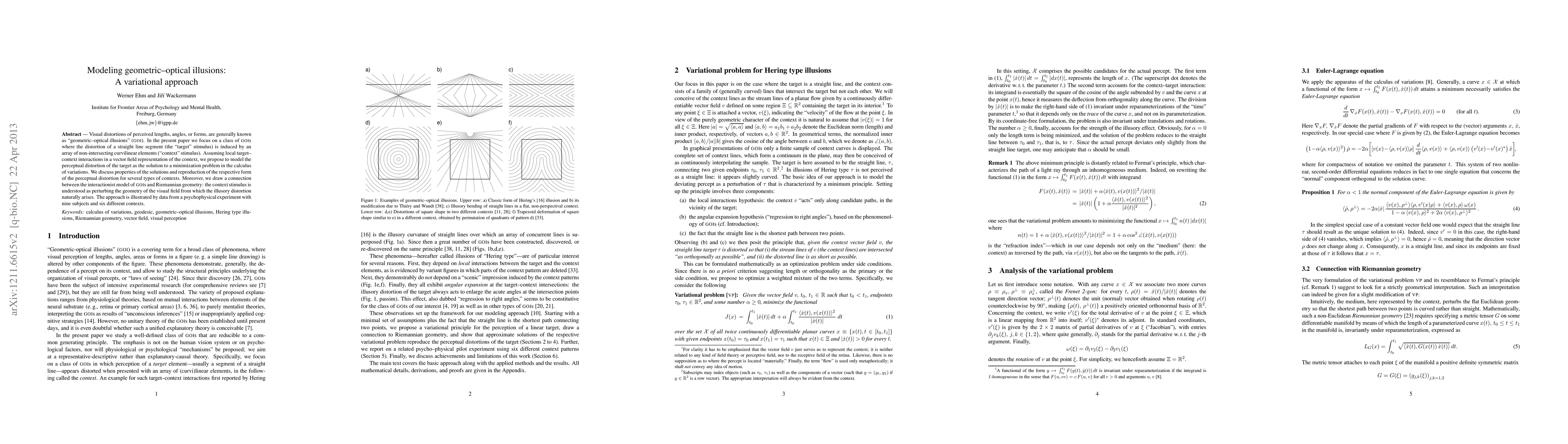 This paper proposes a variational approach to model geometric-optical illusions by minimizing distortion in a vector field representation of context stimuli, and connects this model to Riemannian geometry for perceptual distortion. Psychophysical experiments validate the model's ability to reproduce observed distortions.