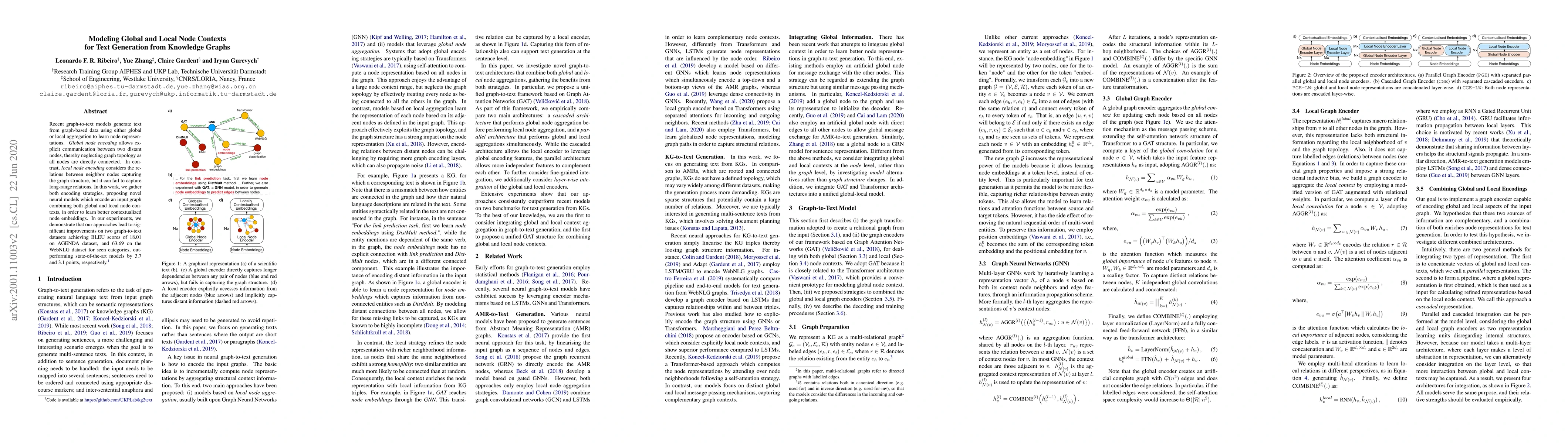 This paper proposes neural models that integrate both global and local node contexts from knowledge graphs to generate text, achieving better node embeddings. The results show significant improvements on two datasets, outperforming existing models by 3.7 and 3.1 BLEU points respectively.