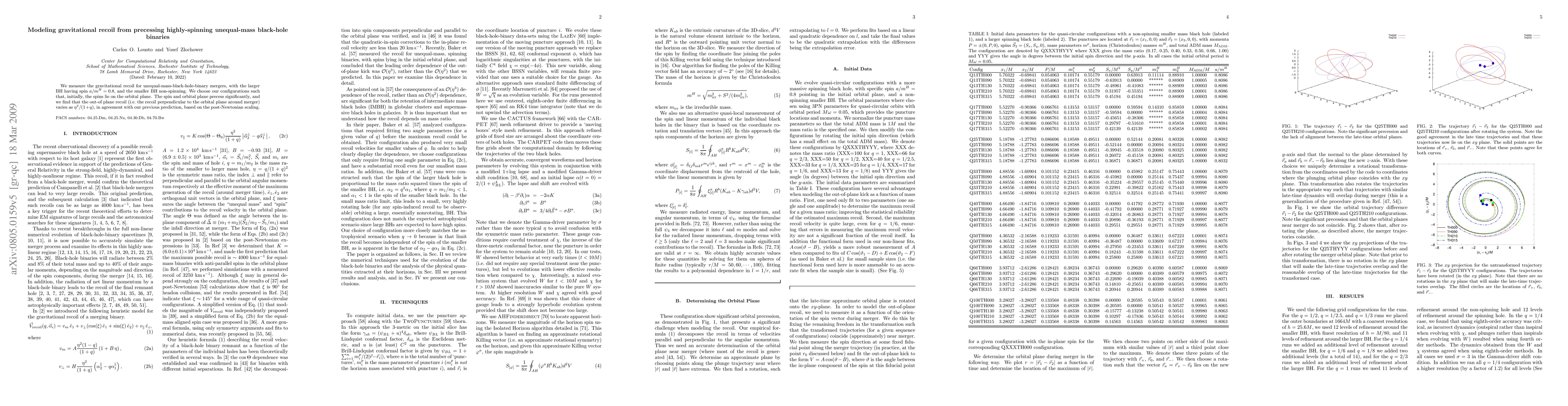 This study models gravitational recoil from unequal-mass black hole binaries with significant spin precession, finding that out-of-plane recoil varies as \(\eta^2 / (1+q)\), consistent with prior post-Newtonian predictions. The larger black hole has a spin of \(a/m^H = 0.8\), while the smaller one is non-spinning.