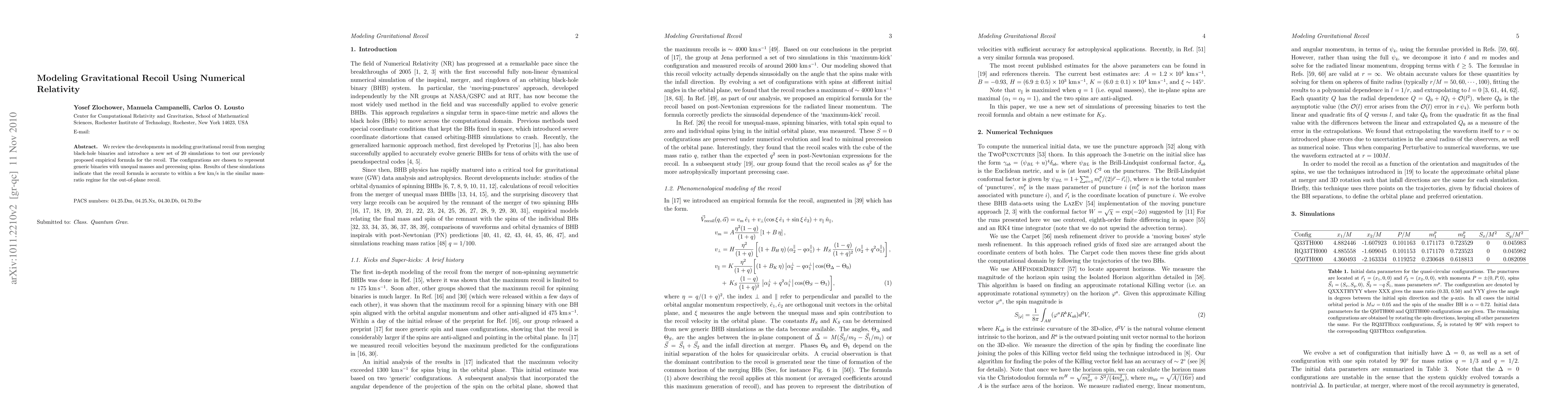 We review the developments in modeling gravitational recoil from merging black-hole binaries and introduce a new set of 20 simulations to test our previously proposed empirical formula for the recoil. The configurations are chosen to represent generic binaries with unequal masses and precessing spins. Results of these simulations indicate that the recoil formula is accurate to within a few km/s in the similar mass-ratio regime for the out-of-plane recoil.