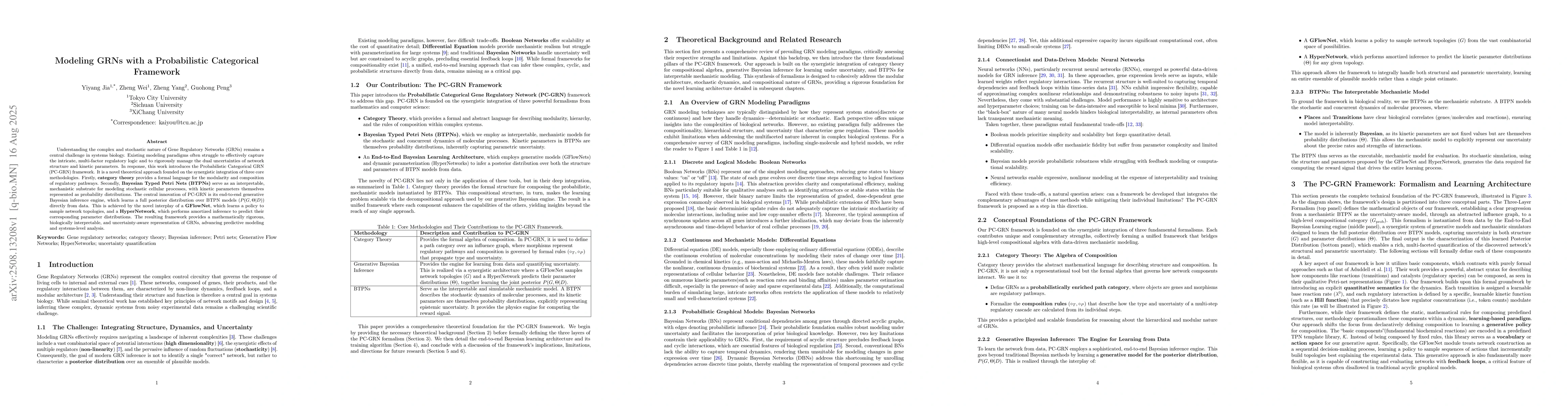 Understanding the complex and stochastic nature of Gene Regulatory Networks (GRNs) remains a central challenge in systems biology. Existing modeling paradigms often struggle to effectively capture the intricate, multi-factor regulatory logic and to rigorously manage the dual uncertainties of network structure and kinetic parameters. In response, this work introduces the Probabilistic Categorical GRN(PC-GRN) framework. It is a novel theoretical approach founded on the synergistic integration of three core methodologies. Firstly, category theory provides a formal language for the modularity and composition of regulatory pathways. Secondly, Bayesian Typed Petri Nets (BTPNs) serve as an interpretable,mechanistic substrate for modeling stochastic cellular processes, with kinetic parameters themselves represented as probability distributions. The central innovation of PC-GRN is its end-to-end generative Bayesian inference engine, which learns a full posterior distribution over BTPN models (P (G, {\Theta}|D)) directly from data. This is achieved by the novel interplay of a GFlowNet, which learns a policy to sample network topologies, and a HyperNetwork, which performs amortized inference to predict their corresponding parameter distributions. The resulting framework provides a mathematically rigorous, biologically interpretable, and uncertainty-aware representation of GRNs, advancing predictive modeling and systems-level analysis.