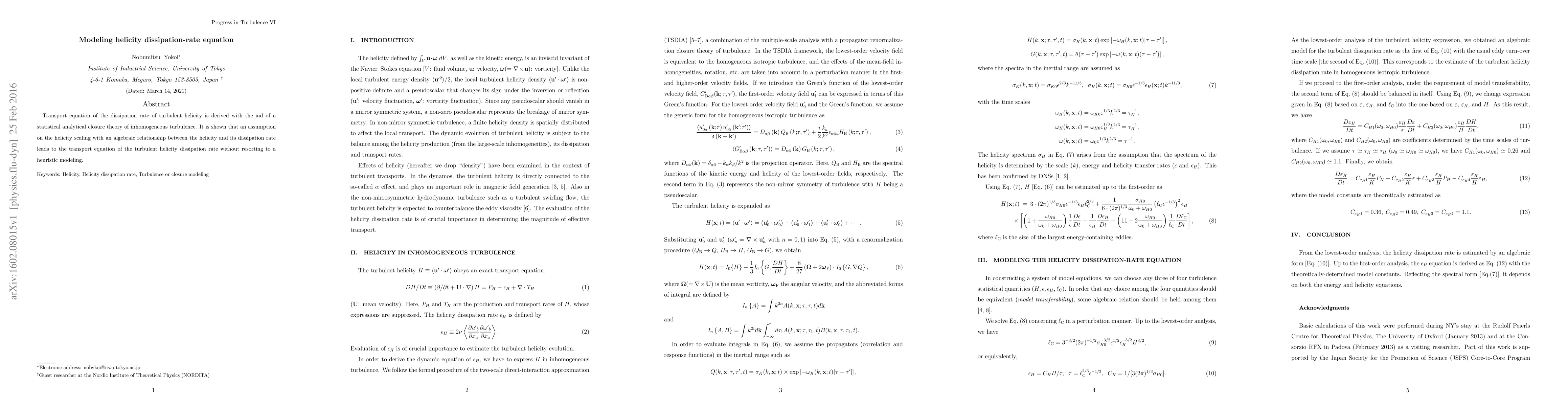 Transport equation of the dissipation rate of turbulent helicity is derived with the aid of a statistical analytical closure theory of inhomogeneous turbulence. It is shown that an assumption on the helicity scaling with an algebraic relationship between the helicity and its dissipation rate leads to the transport equation of the turbulent helicity dissipation rate without resorting to a heuristic modeling.