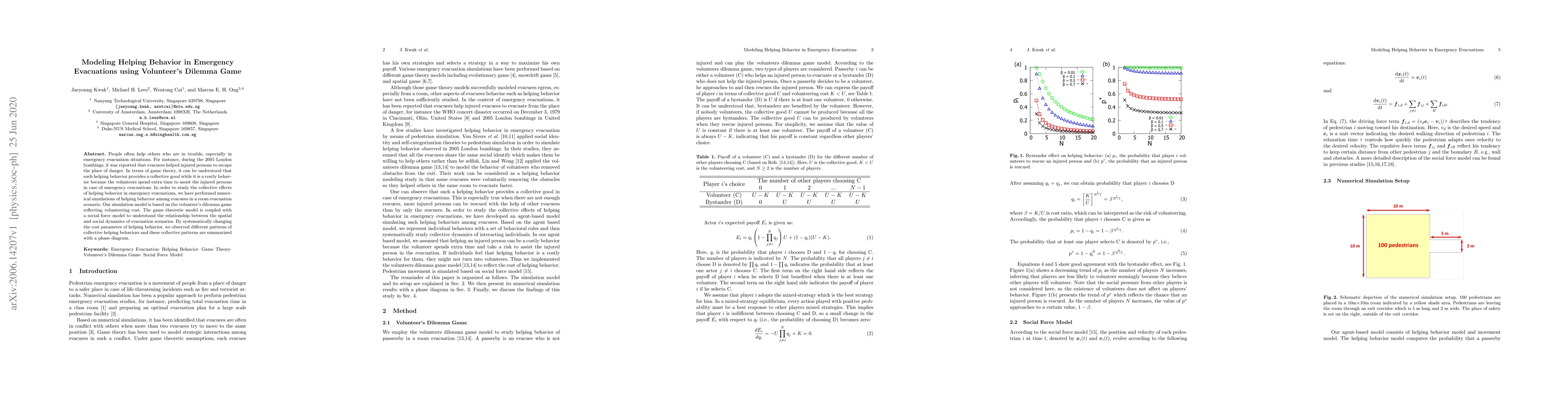 This study models helping behavior during emergency evacuations using the volunteer's dilemma game, simulating collective effects through a coupled game theoretic and social force model. It identifies varying patterns of collective helping based on the cost of volunteering, summarized in a phase diagram.
